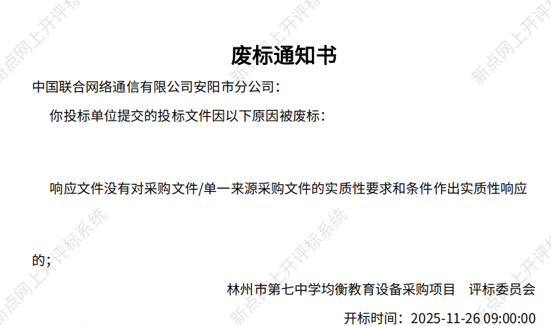 | 评标结果如下: 第一成交候选人:河南华阳影音科技有限公司,最终报价******元;第二成交候选人:河南省麦秆菊文化传媒有限公司,最终报价******元;第三成交候选人:河南鑫语航信息科技有限公司,最终报价******元;其他情况:郑州沃众电子科技有限公司,最终报价******元;废标情况:中国联合网络通信有限公司安阳市分公司:响应文件没有对采购文件/单一来源采购文件的实质性要求和条件作出实质性响应的。 各有关当事人对评标结果如有异议者,可以在公告结束之日起七个工作日内,以书面形式向采购人、采购代理机构提出质疑(加盖单位公章且法定代表人签字,并附带相应的证明材料),由法定代表人或其授权代表携带企业营业执照复印件(加盖公章)及授权委托书、本人身份证件(原件)一并提交(邮寄、邮件不予受理),并以质疑函接受确认日期作为受理时间。逾期未提交或未按照要求提交的质疑函将不予受理。 | |||||||||||||||||||||||||||||||