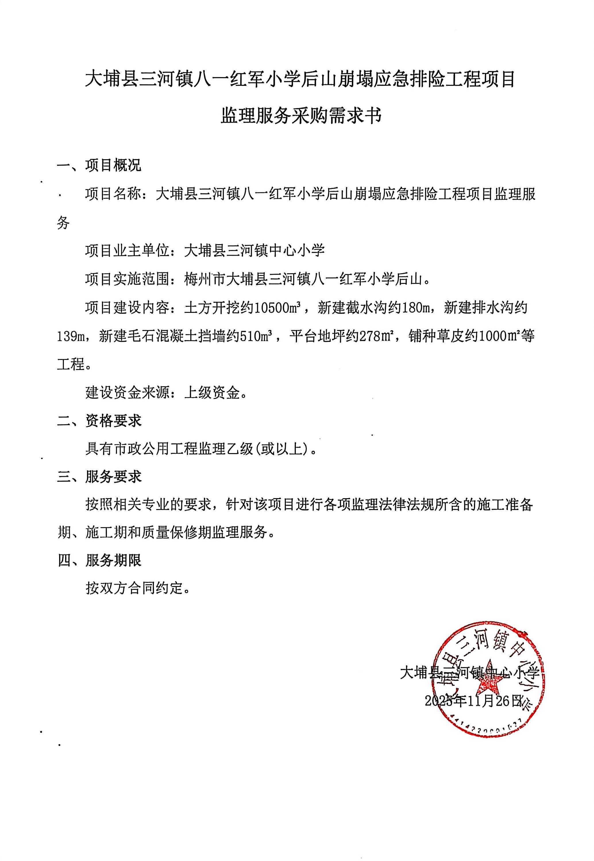 大埔县三河镇八一红军小学后山崩塌应急排险工程项目监理服务采购公告