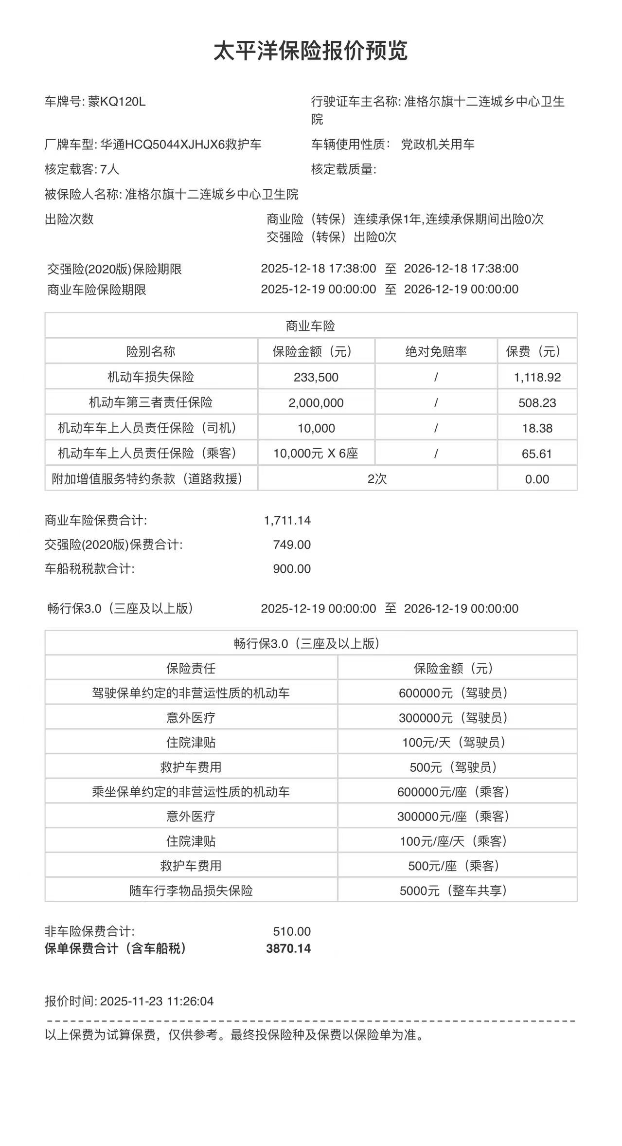一、合同编号:***二、合同名称:蒙******救护车保险采购三、项目编号:鄂财购备字(电子)[****]*******号四、项目名称:救护车保险五、合同主体采购人(甲方):准格尔旗十二连城乡中心卫生院 地址:鄂尔多斯市准格尔旗 联系方式:*********** 供应商(乙方):中国太平洋财产保险股份有限公司鄂尔多斯中心支公司 地址:薛家湾 联系方式:*********** 六、合同主要信息主要标的: