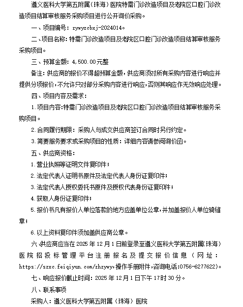 遵医五院特需门诊改造项目及老院区口腔门诊改造项目结算审核服务采购项目公开询价公告