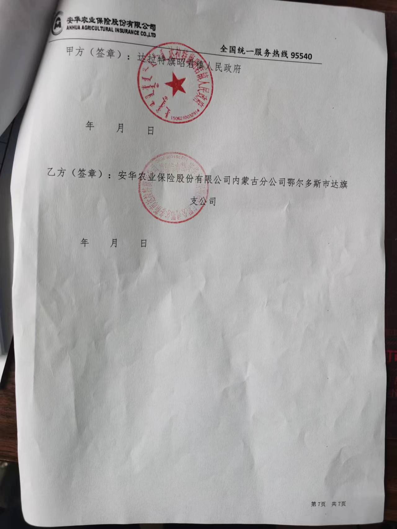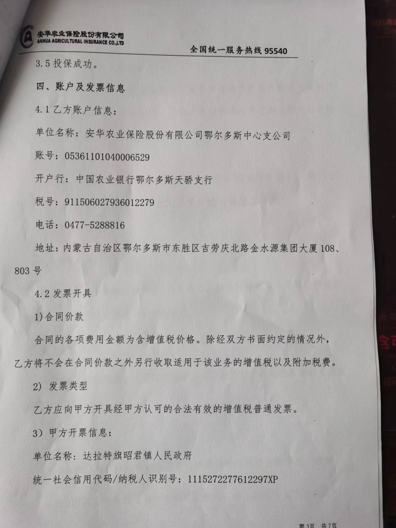 一、合同编号:***二、合同名称:保险投保协议三、项目编号:鄂财购备字(电子)[****]*******号四、项目名称:公务用车保险服务五、合同主体采购人(甲方):昭君镇人民政府 地址:鄂尔多斯市达拉特旗昭君镇城拐 联系方式:*********** 供应商(乙方):安华农业保险股份有限公司鄂尔多斯中心支公司 地址:内蒙古自治区鄂尔多斯市东胜区内蒙古自治区鄂尔多斯市东胜区吉劳庆北路金水源集团大厦***.***号 联系方式:*********** 六、合同主要信息主要标的: