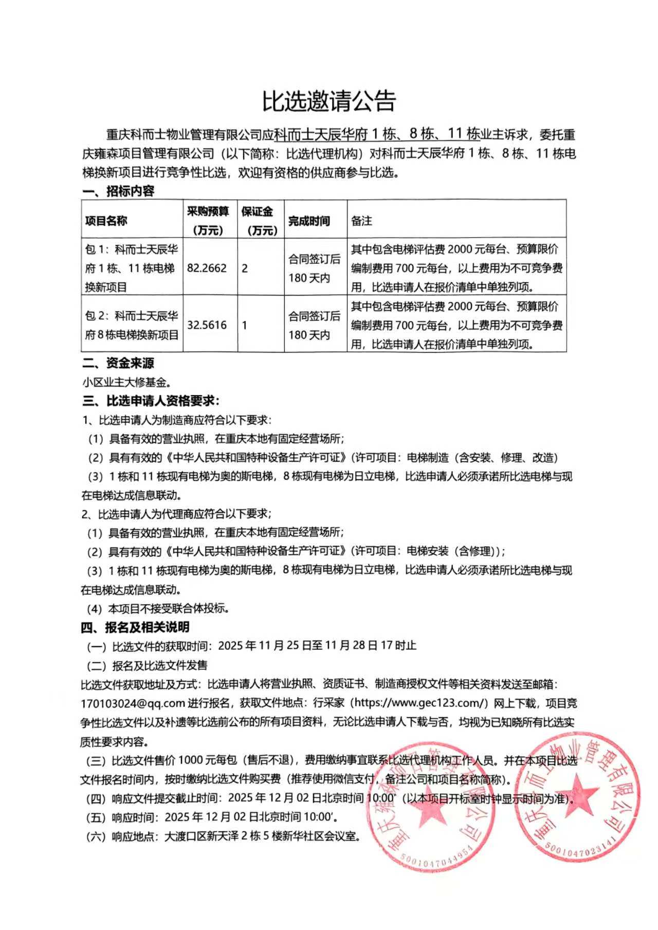 科而士.天辰华府*栋、*栋、**栋电梯换新项目更正一号公告