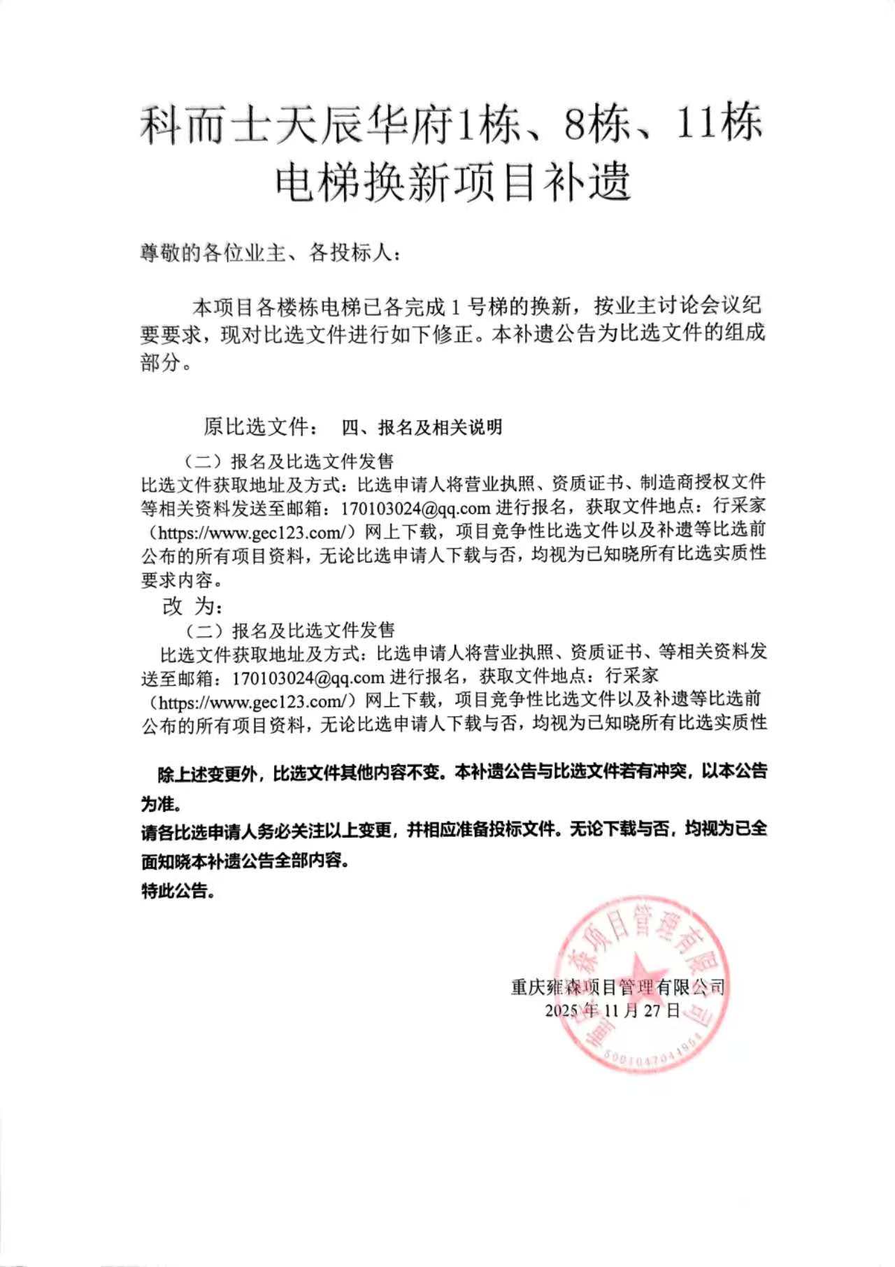 科而士.天辰华府1栋、8栋、11栋电梯换新项目更正一号公告