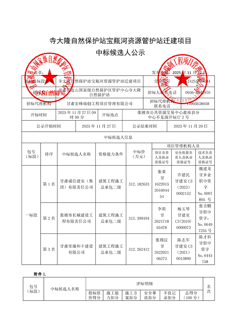 [肃南县]寺大隆自然保护站宝瓶河资源管护站迁建项目中标候选人公示