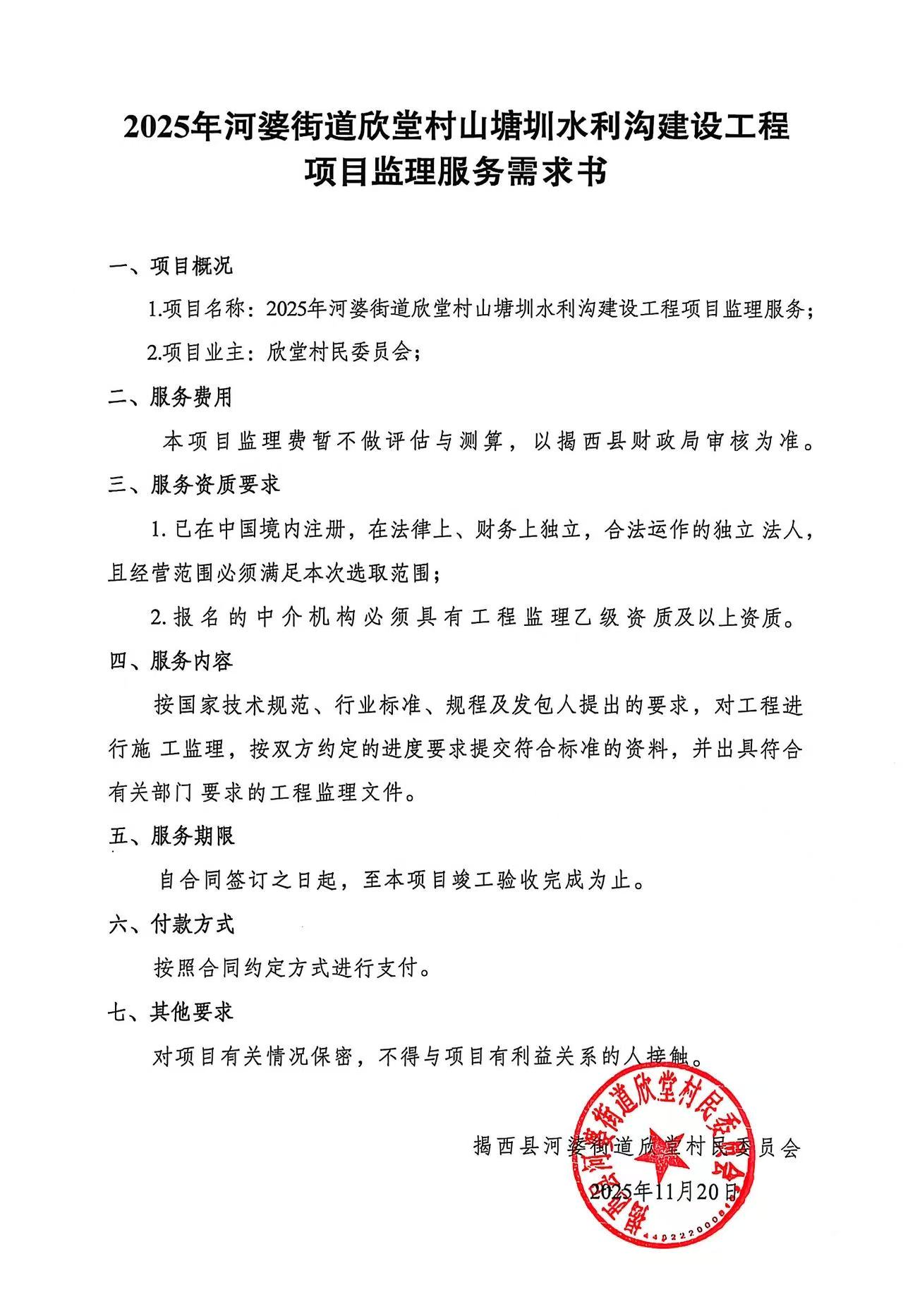 2025年河婆街道欣堂村山塘圳水利沟建设工程项目监理服务采购公告