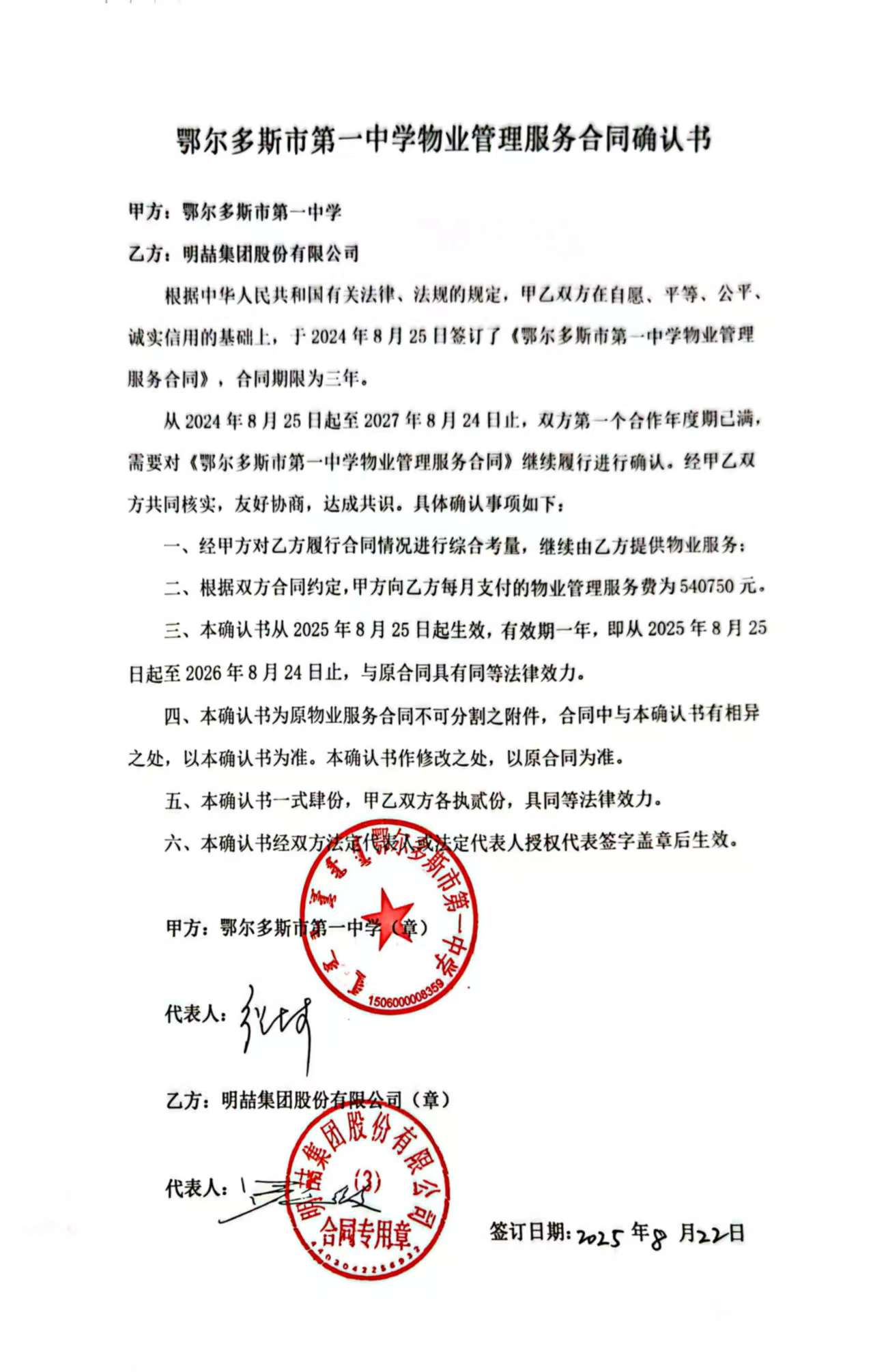 鄂尔多斯市第一中学鄂尔多斯市第一中学物业管理服务合同确认书政府采购合同公告