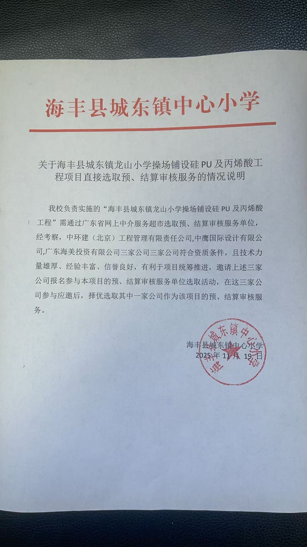 关于为【海丰县城东镇龙山小学操场铺设硅**及丙烯酸工程项目直接选取预、结算审核服务】公开选取【工程造价咨询】机构的公告