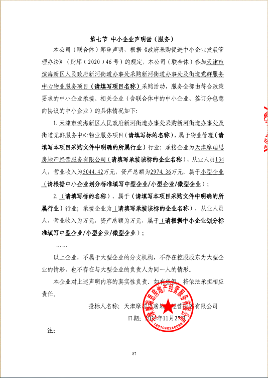 受天津市滨海新区人民政府新河街道办事处委托,天津市滨海新区政府采购中心以公开招标方式,对天津市滨海新区人民政府新河街道办事处采购新河街道办事处及街道党群服务中心物业服务项目实施采购,现将中标结果公布如下: 一、项目名称和编号 *.项目名称:天津市滨海新区人民政府新河街道办事处采购新河街道办事处及街道党群服务中心物业服务项目 *.项目编号:**************** 二、中标信息 *.中标供应商名称:天津摩瑞思房地产经营服务有限公司 *.中标供应商地址:天津滨海高新区华苑产业区兰苑路*号***** *.供应商评审报价、评审总得分及排序情况:见附件 *.主要中标标的名称、规格型号、数量、单价、服务要求或者标的基本概况:物业服务 三、评标委员会成员名单 程冰、杨雅惠、单战、王娟、陈继鹏(采购人代表) 四、项目联系人及联系方式 *.联系人:肖琳 *.联系方式:************ 五、采购人的名称、地址和联系方式 *.采购人名称:天津市滨海新区人民政府新河街道办事处 *.采购人地址:天津市滨海新区塘沽杭州道西侧 *.采购人联系电话:谢磊,************ 六、采购代理机构的名称、地址和联系方式 *.采购代理机构名称:天津市滨海新区政府采购中心 *.采购代理机构地址:天津市滨海新区营口道***号 *.采购代理机构联系方式:************ 七、质疑方式 参与本项目政府采购活动的供应商认为中标结果使自己的合法权益受到损害的,可以在中标结果公告期限届满之日起*个工作日内,以书面形式向采购人和天津市滨海新区政府采购中心提出质疑,逾期不予受理。 八、本项目不向中标供应商收取服务费。 九、中标结果公告期限 中标结果的公告期限为*个工作日。 十、招标文件公告:见附件