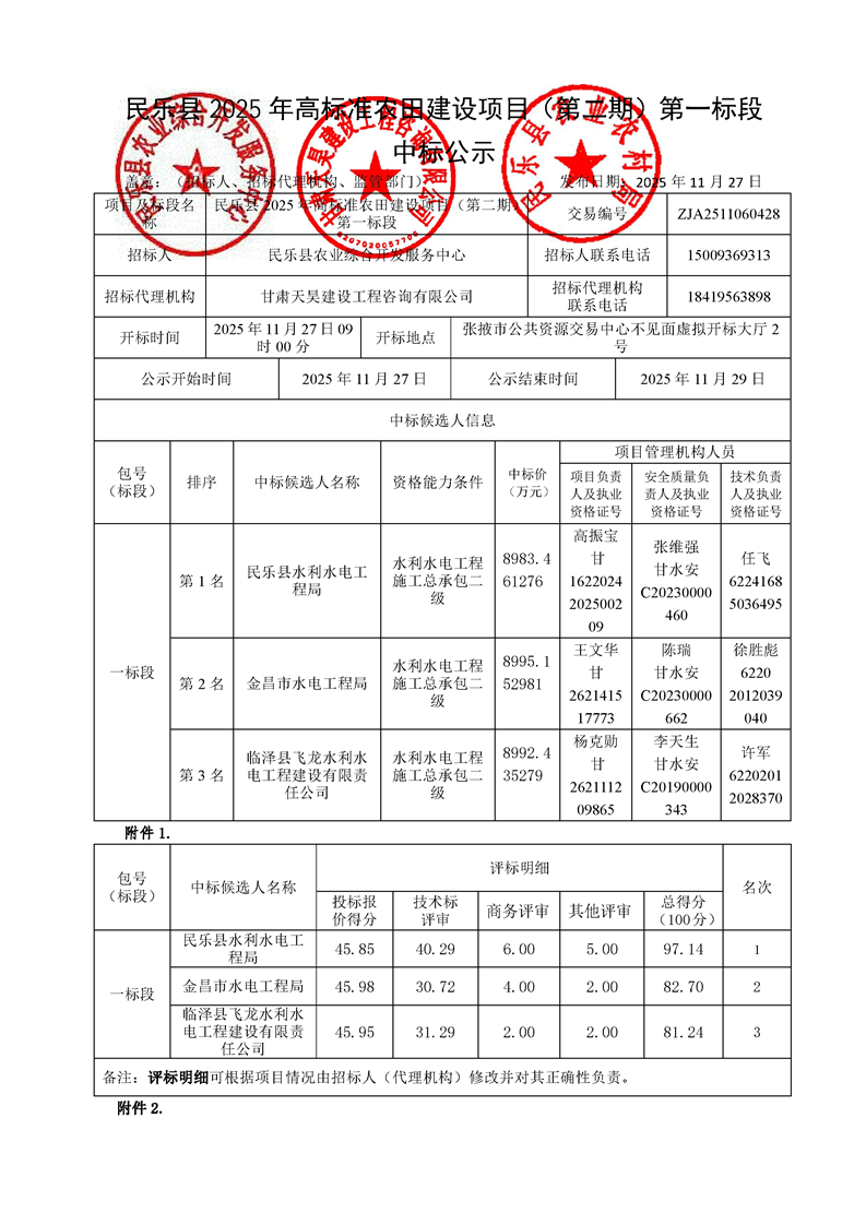 [市本级]民乐县2025年高标准农田建设项目(第二期)第一标段中标候选人公示