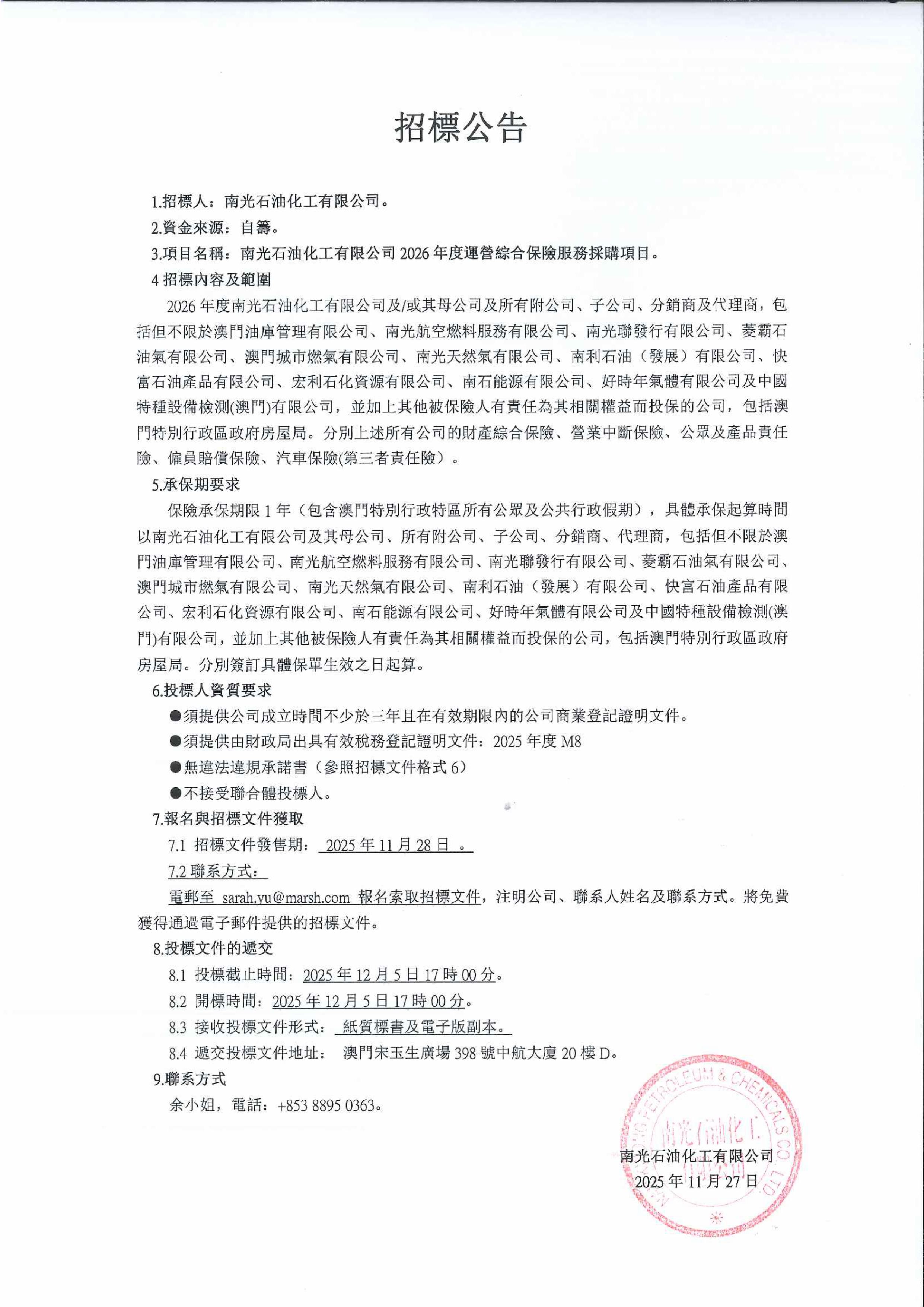 南光石油化工有限公司2026年度運營綜合保險服務採購項目招标公告