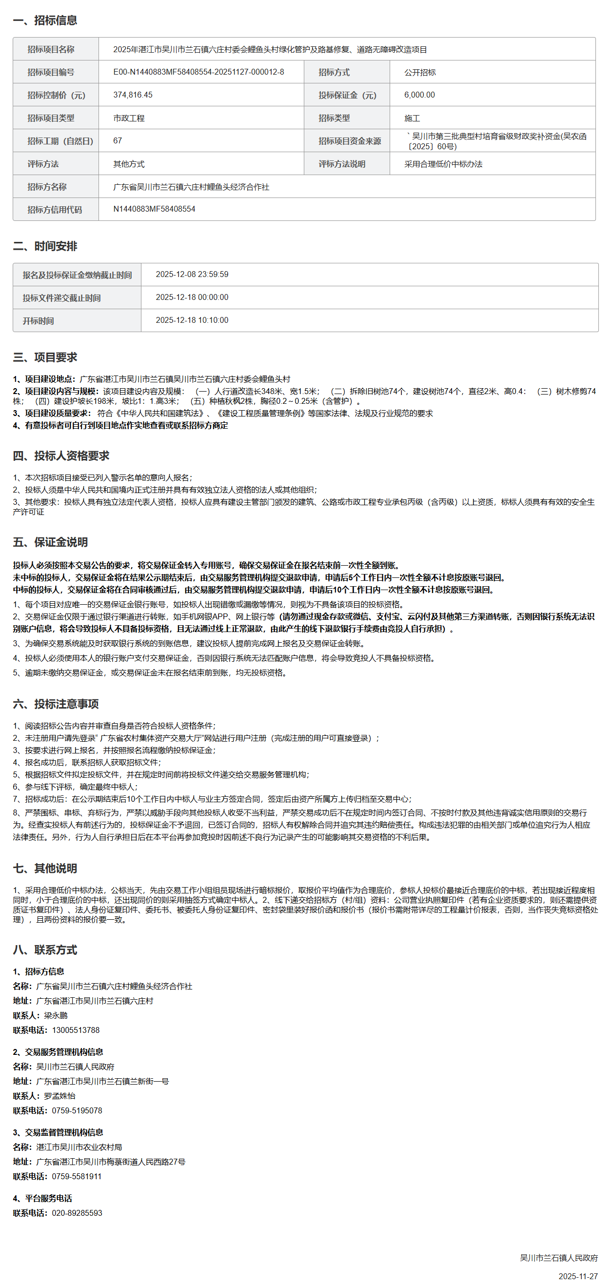 2025年湛江市吴川市兰石镇六庄村委会鲤鱼头村绿化管护及路基修复、道路无障碍改造项目招标公告