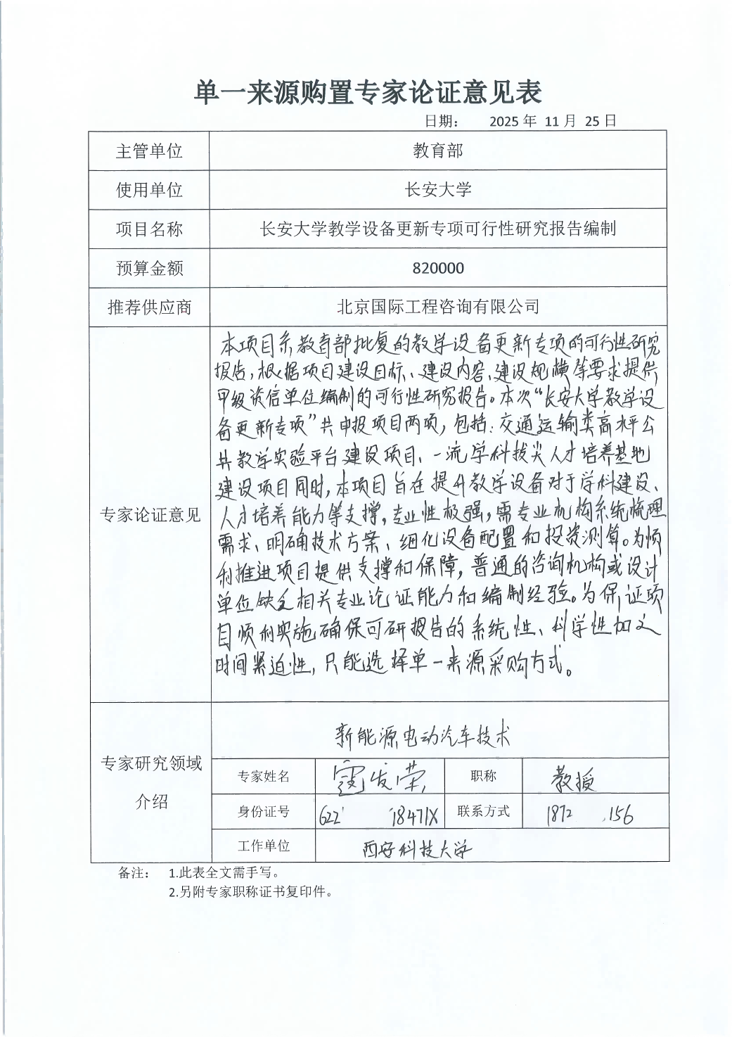 长安大学教学设备更新专项可行性研究报告编制采购项目单一来源采购公示