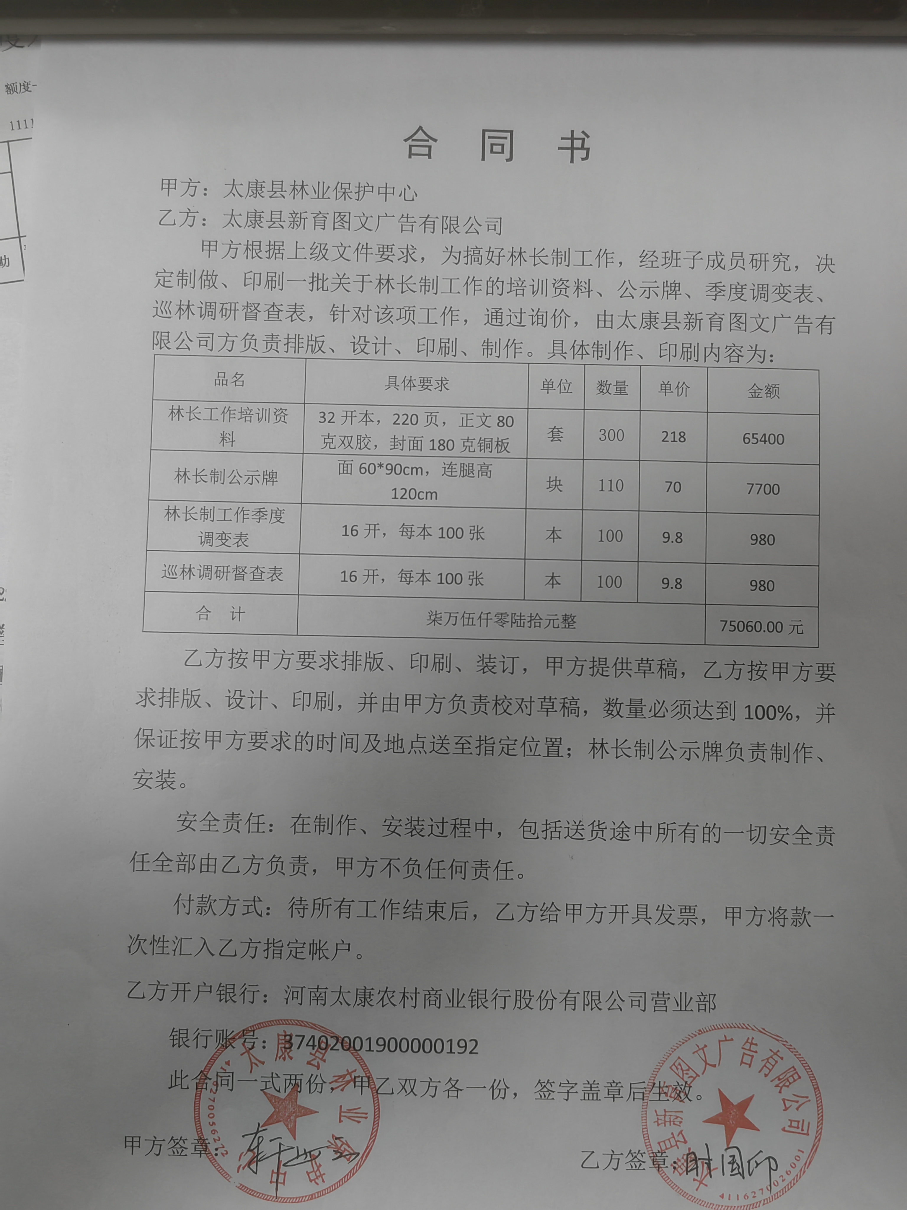 | 二、合同名称:太康县林长制办公室打印制作林长制培训资料、公示牌等采购项目 | ||||||||||||