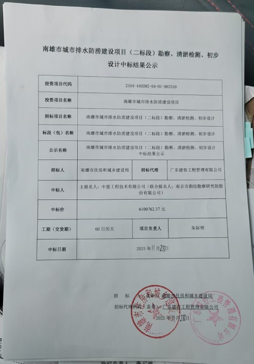 南雄市城市排水防涝建设项目(二标段)勘察、清淤检测、初步设计中标结果公示