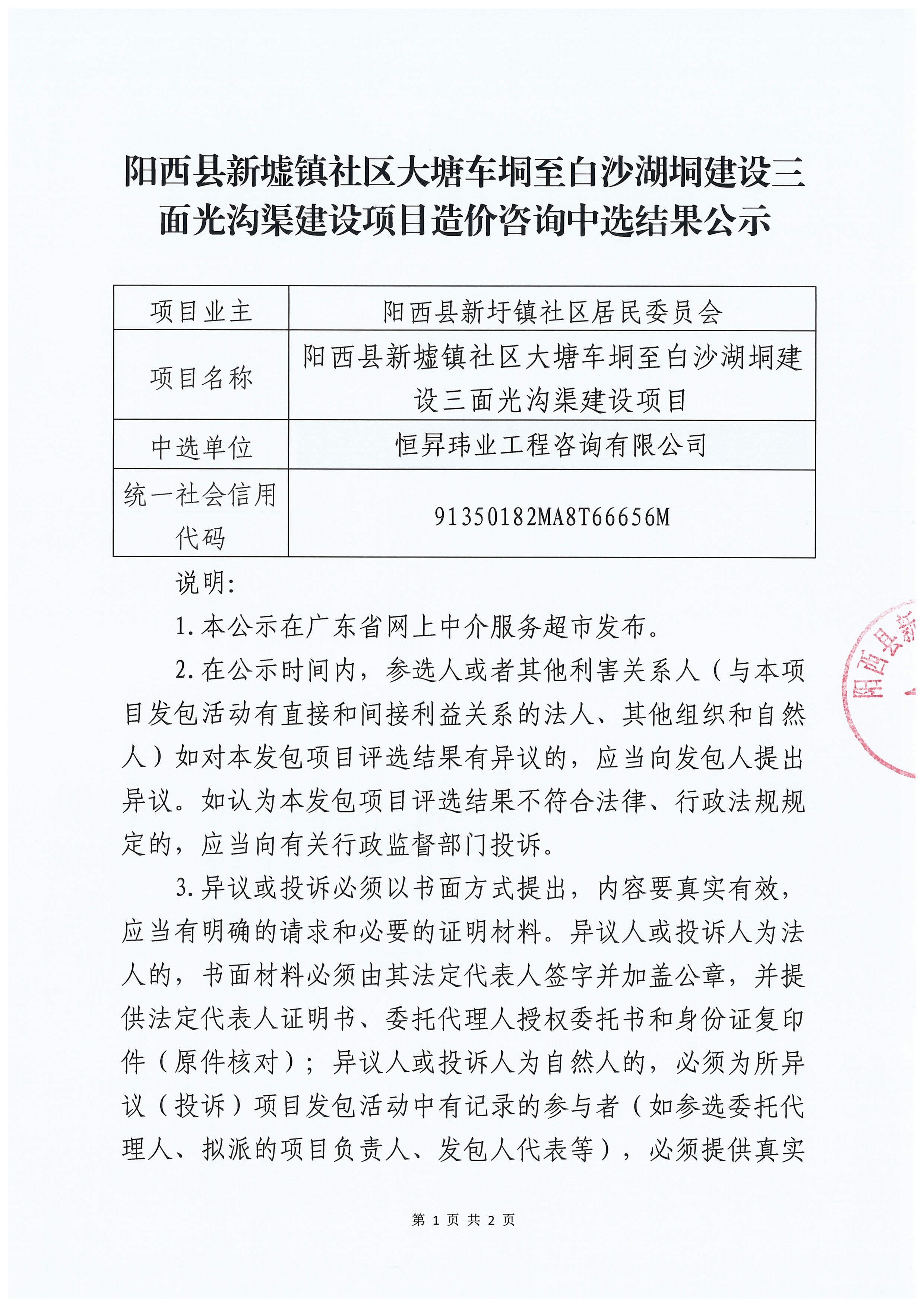 关于【 阳西县新墟镇社区大塘车垌至白沙湖垌建设三面光沟渠建设项目】中选结果的公告