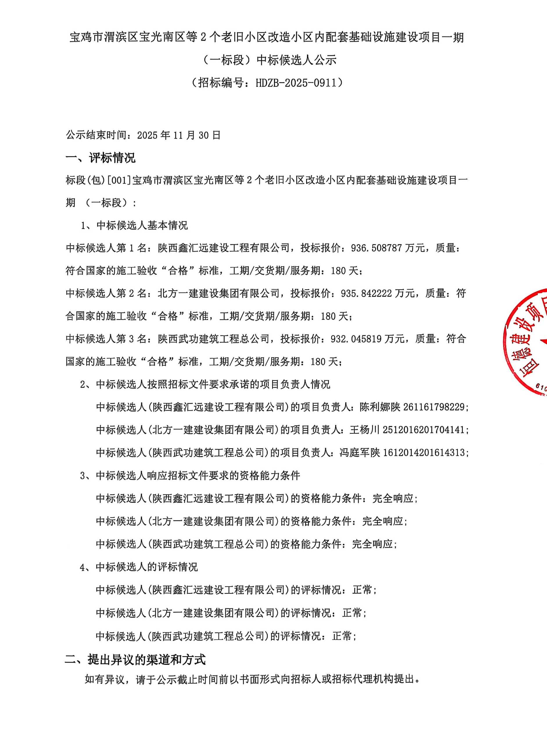 宝光南区等*个老旧小区改造小区内配套基础设施建设项目一期一标段中标候选人公示
