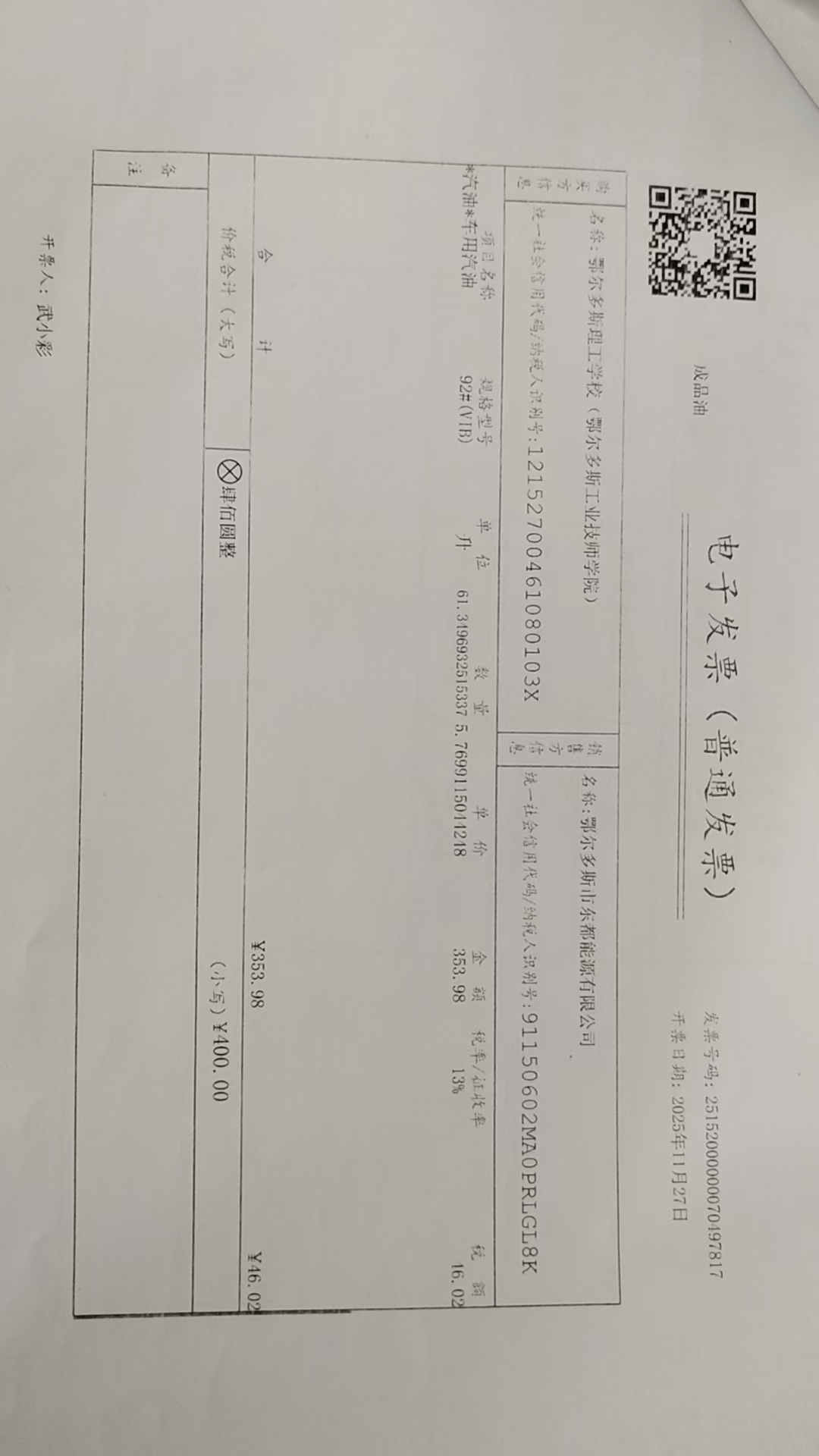 鄂尔多斯理工学校燃油费政府采购合同公告