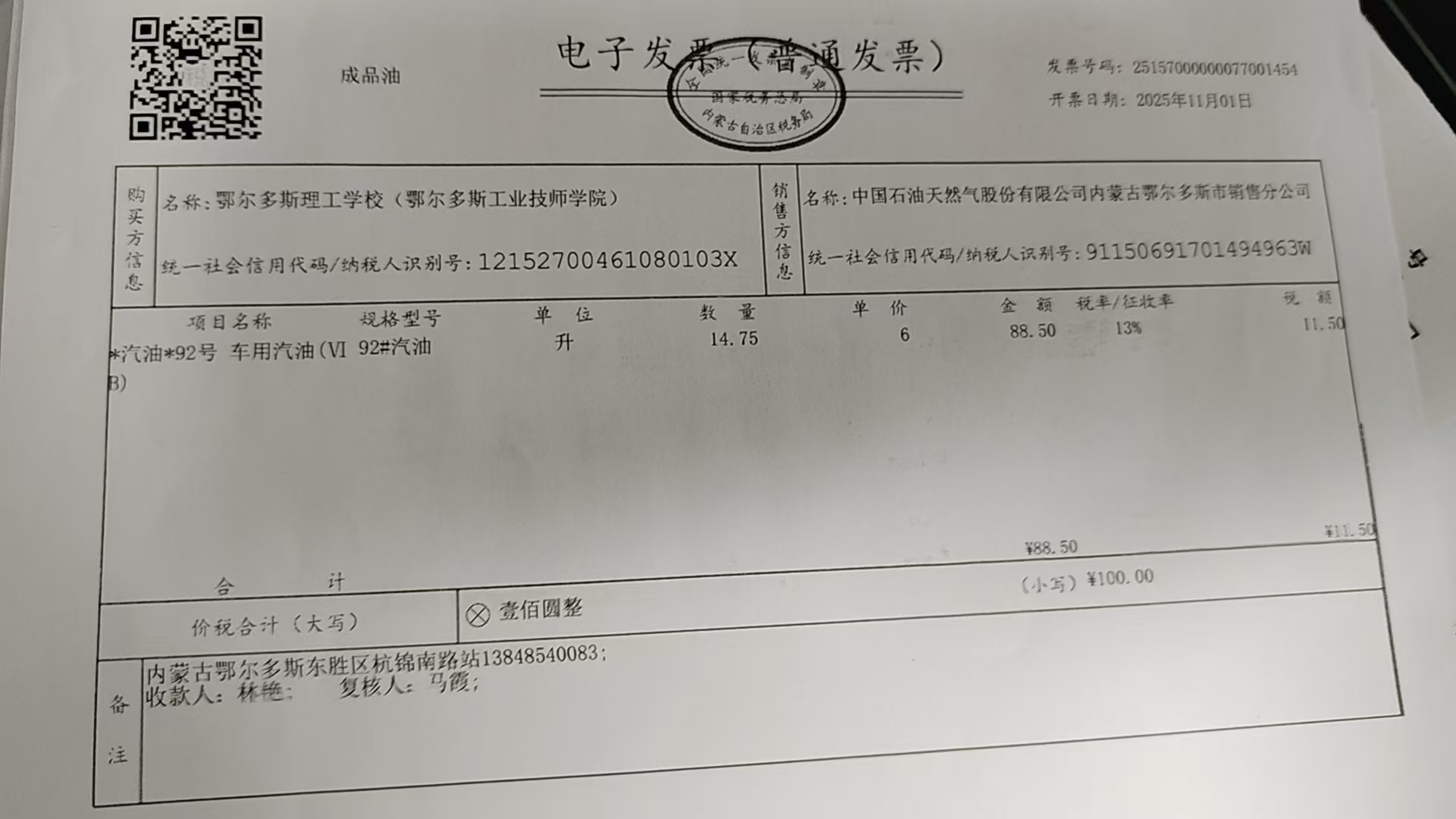 鄂尔多斯理工学校燃油费政府采购合同公告