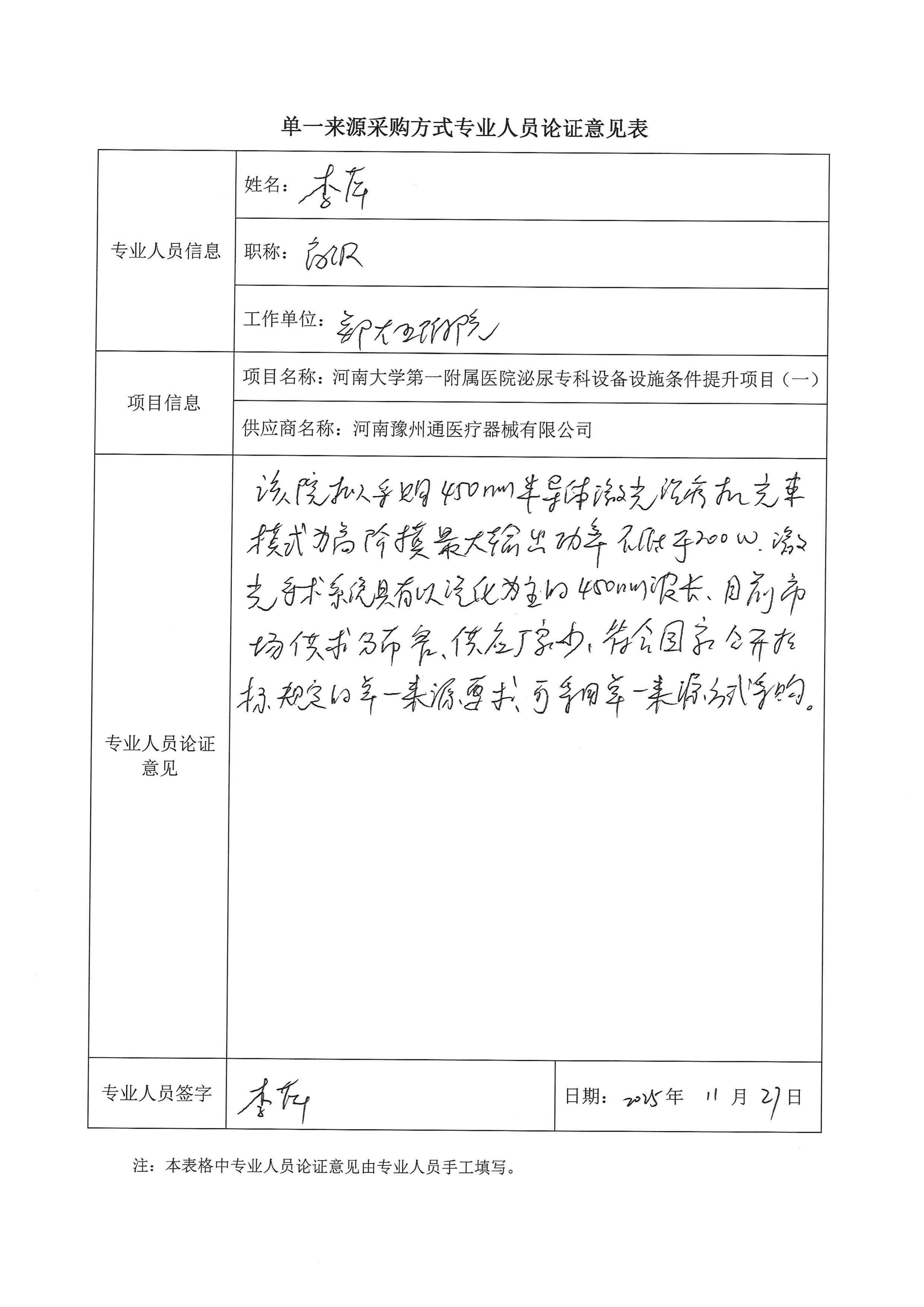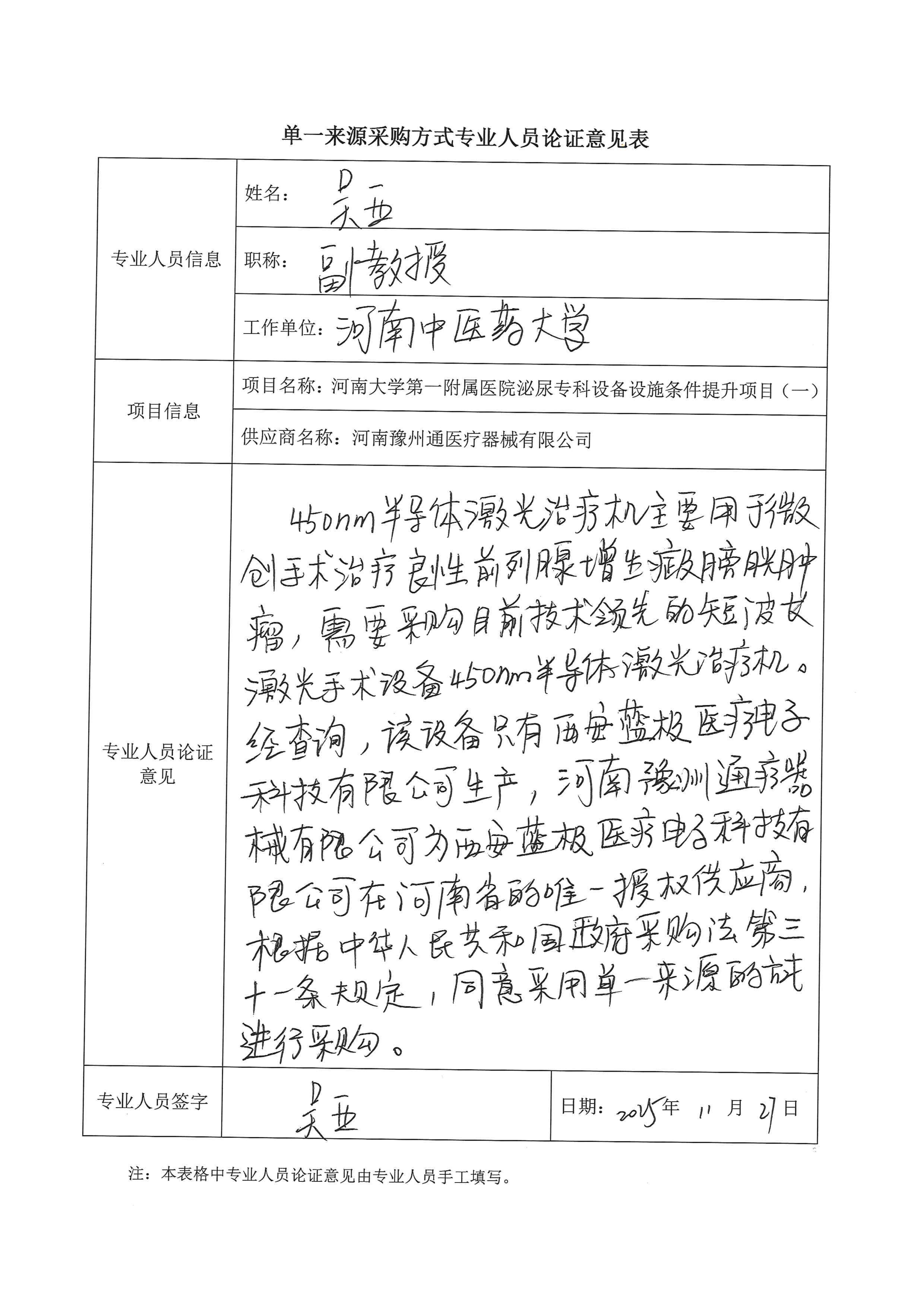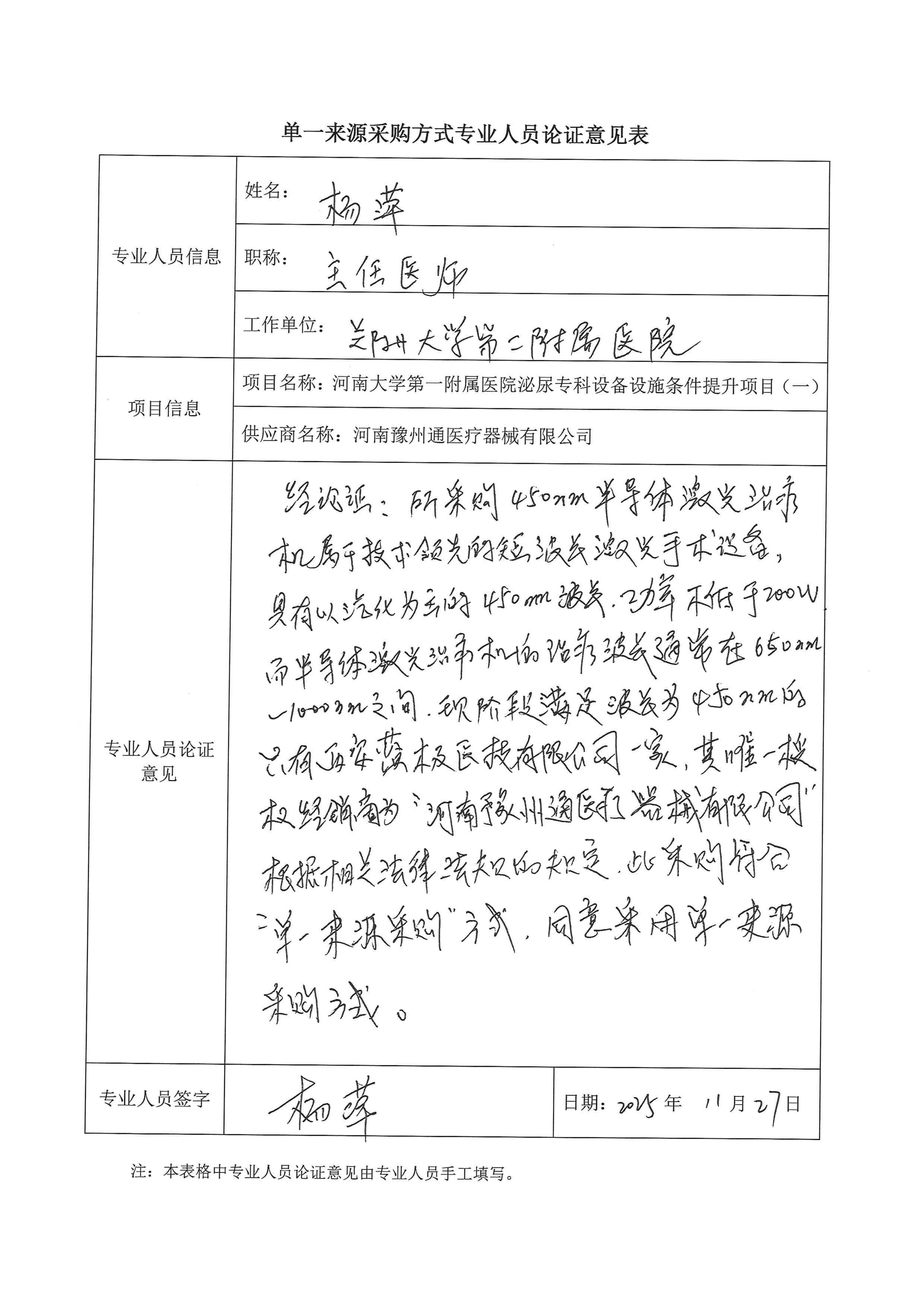 | 我院拟开展微创手术治疗良性前列腺增生症,需采购目前技术领先的短波长激光手术设备,半导体激光治疗机波长为*****,功率为****,作用是软组织的汽化切割。由于*****的激光设备在中国境内乃至全球范围内目前只有西安蓝极医疗电子科技有限公司生产,能够满足临床对手术效率和安全性的高标准要求,河南豫州通医疗器械有限公司是针对本项目河南地区的唯一授权经销商,符合中华人民共和国政府采购法第三十一条中第一条规定,拟申请采用单一来源采购。 | ||||||||||||||||