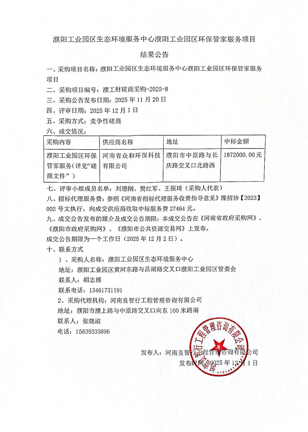 濮阳工业园区生态环境服务中心濮阳工业园区环保管家服务项目-成交公告