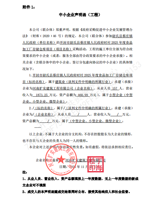开封市尉氏县蔡庄镇人民政府时村2025年度食品加工厂存储仓库项目成交公告