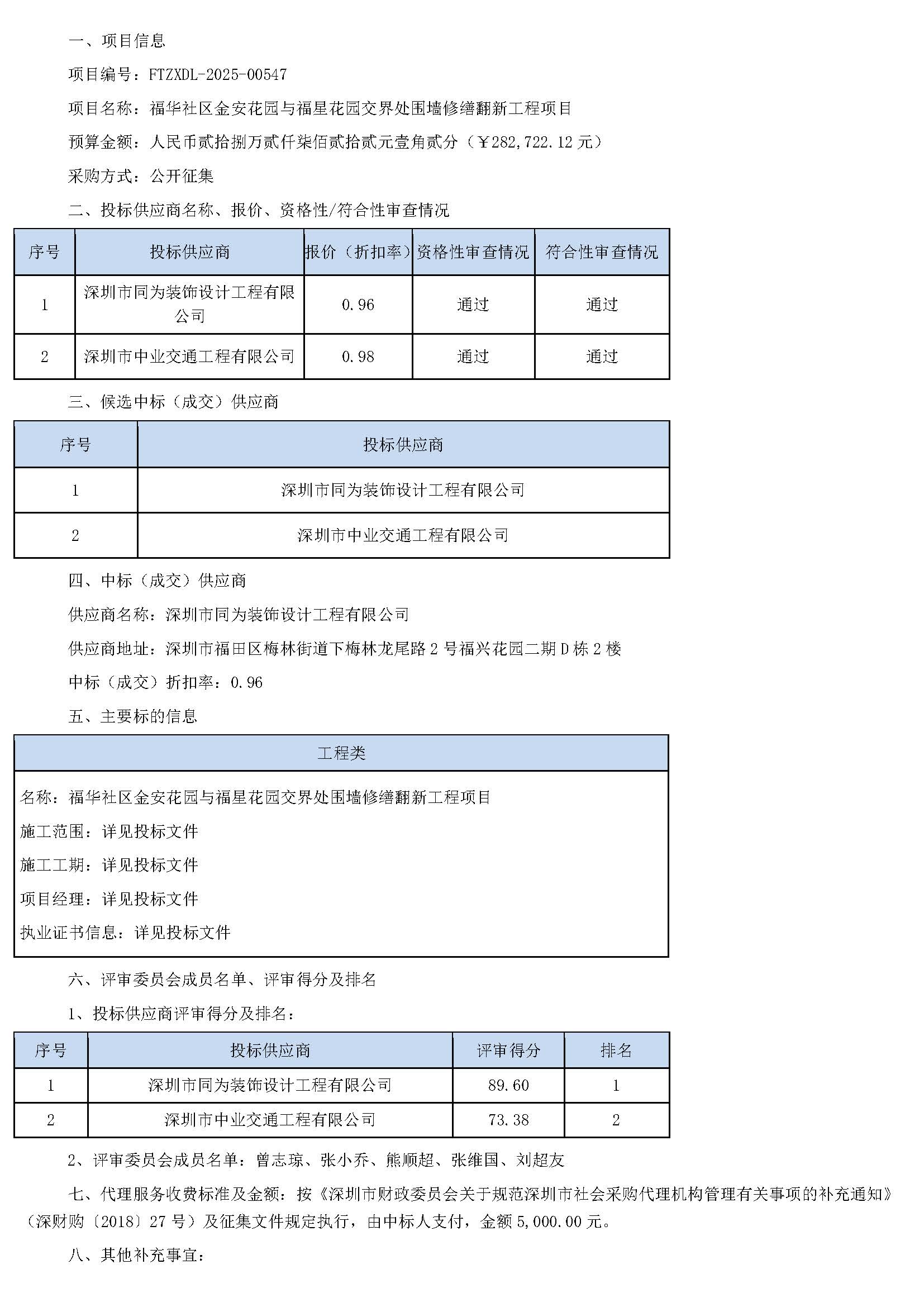 5福华社区金安花园与福星花园交界处围墙修缮翻新工程项目的采购结果公告
