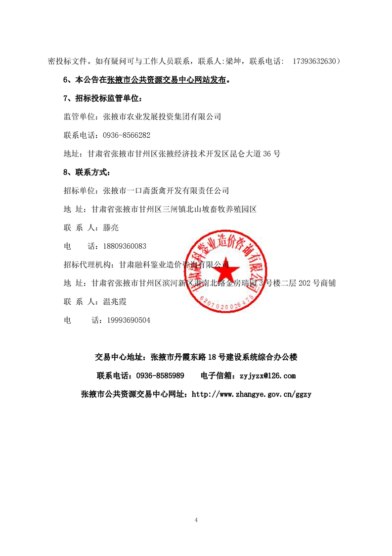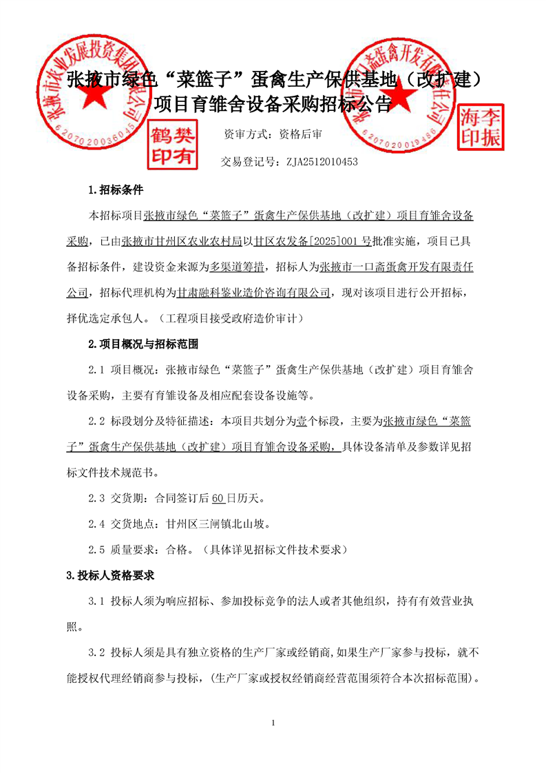 张掖市绿色“菜篮子”蛋禽生产保供基地(改扩建)项目育雏舍设备采购招标/资审公告