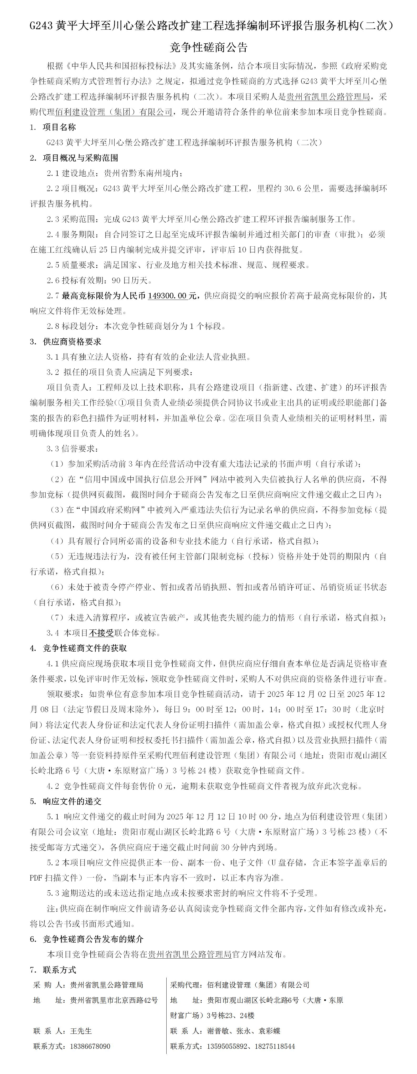 G243黄平大坪至川心堡公路改扩建工程选择编制环评报告服务机构(二次)竞争性磋商公告