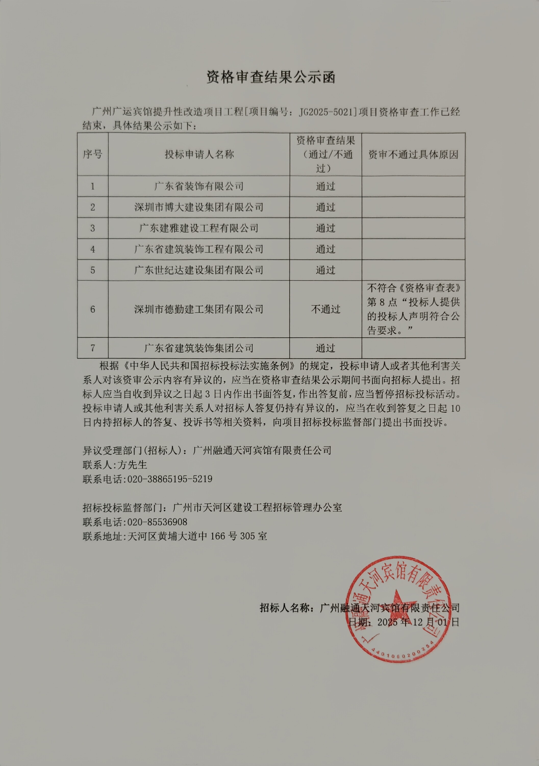 广州广运宾馆提升性改造项目工程[项目编号:***********]项目资格审查工作已经结束,具体结果公示如下: