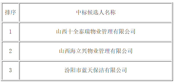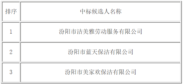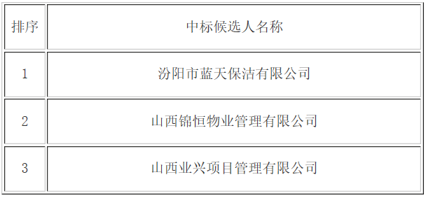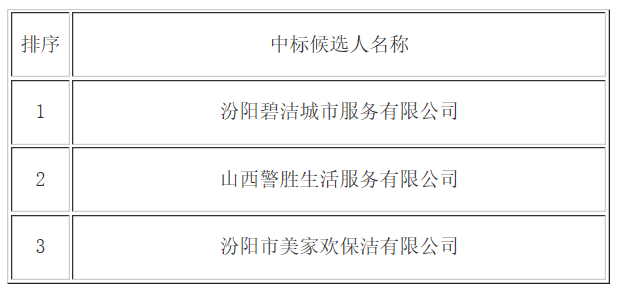 本山西杏花村汾酒厂股份有限公司区域****年环境卫生承包项目(招标项目编号:****招【****】****号),经评标委员会评审,确定山西杏花村汾酒厂股份有限公司区域****年环境卫生承包项目的中标候选人,现公示如下: