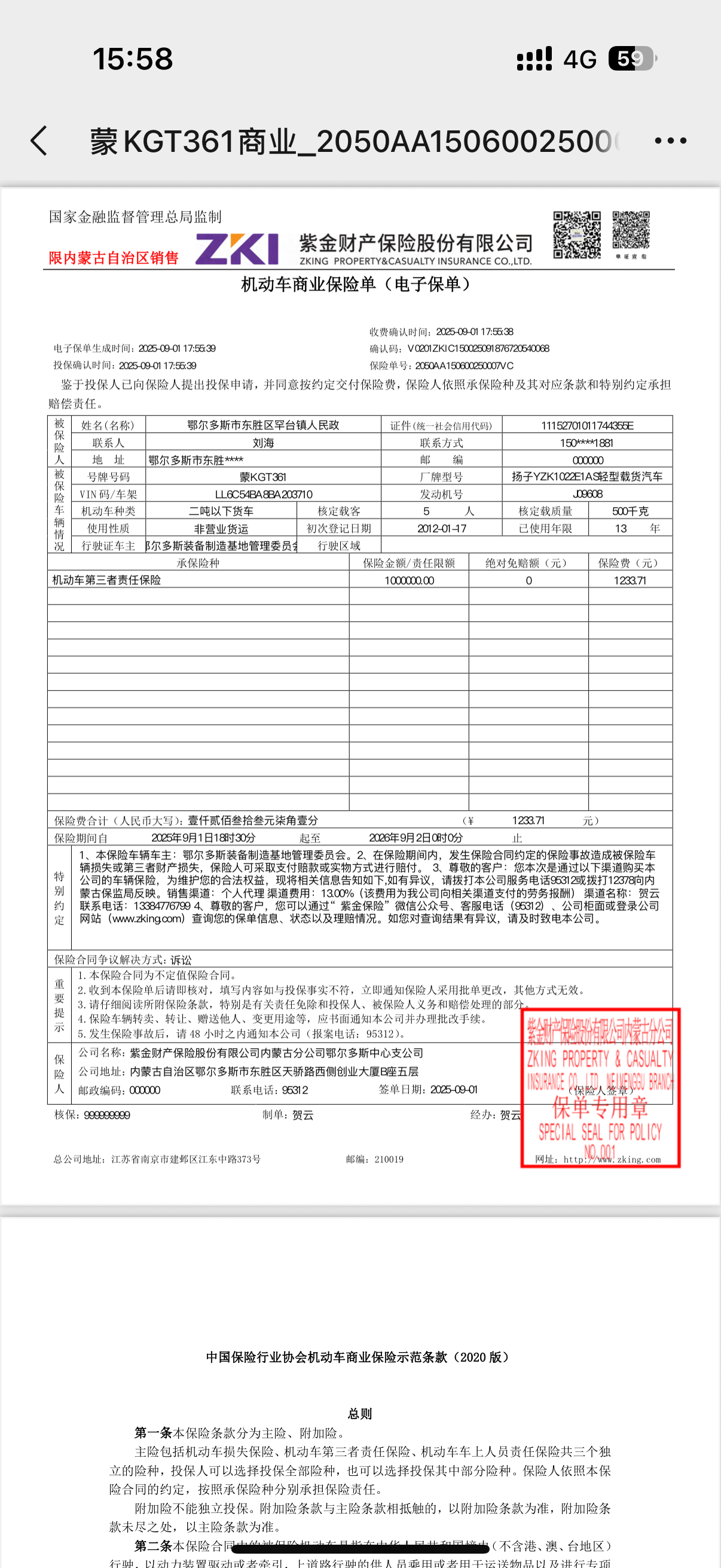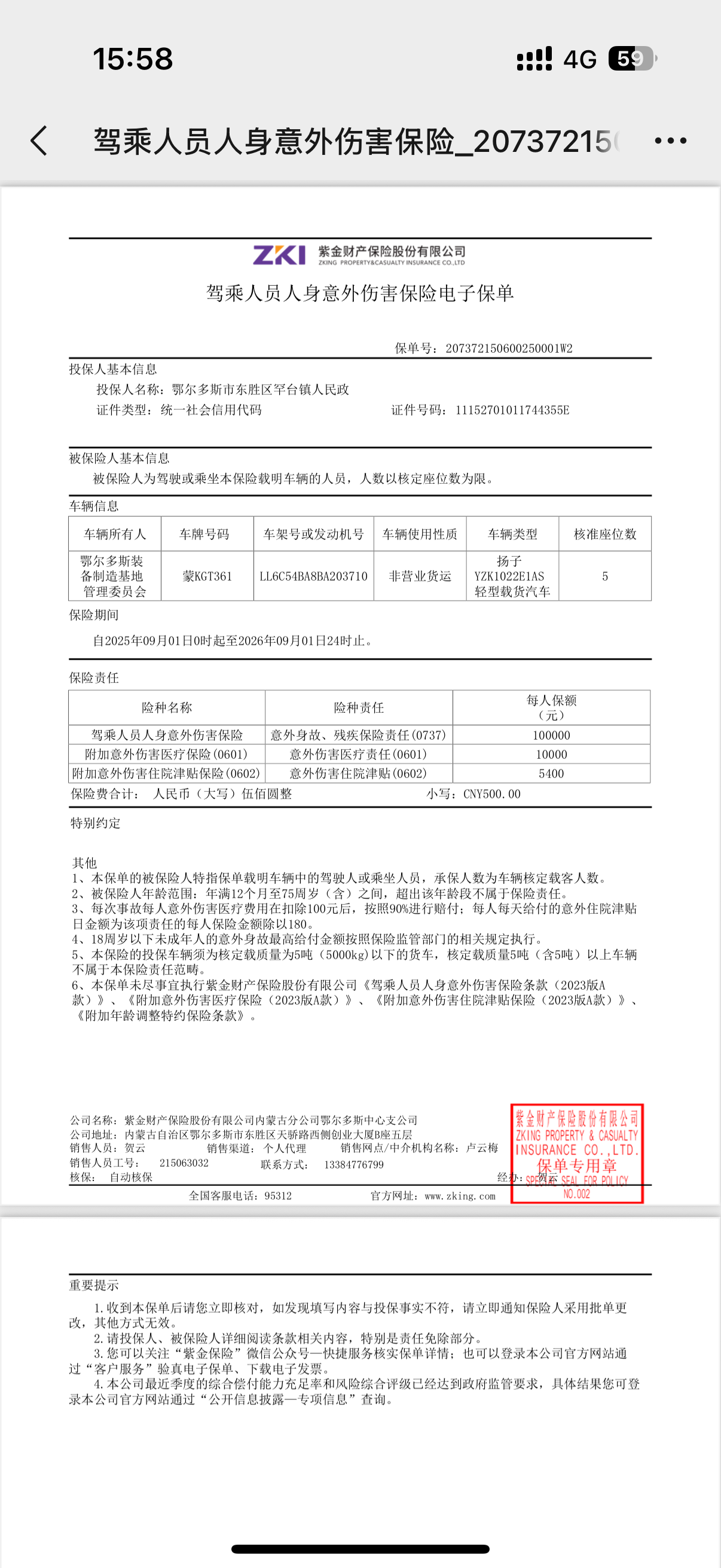 一、合同编号:鄂财购备字(电子)[****]*******号二、合同名称:防火业务用车保单三、项目编号:鄂财购备字(电子)[****]*******号四、项目名称:防火业务用车保险五、合同主体采购人(甲方):鄂尔多斯市东胜区罕台镇人民政府 地址:鄂尔多斯市东胜区 联系方式:*********** 供应商(乙方):紫金财产保险股份有限公司内蒙古分公司鄂尔多斯中心支公司 地址:内蒙古自治区鄂尔多斯市东胜区天骄路西侧创业大厦*座五楼 联系方式:*********** 六、合同主要信息主要标的: