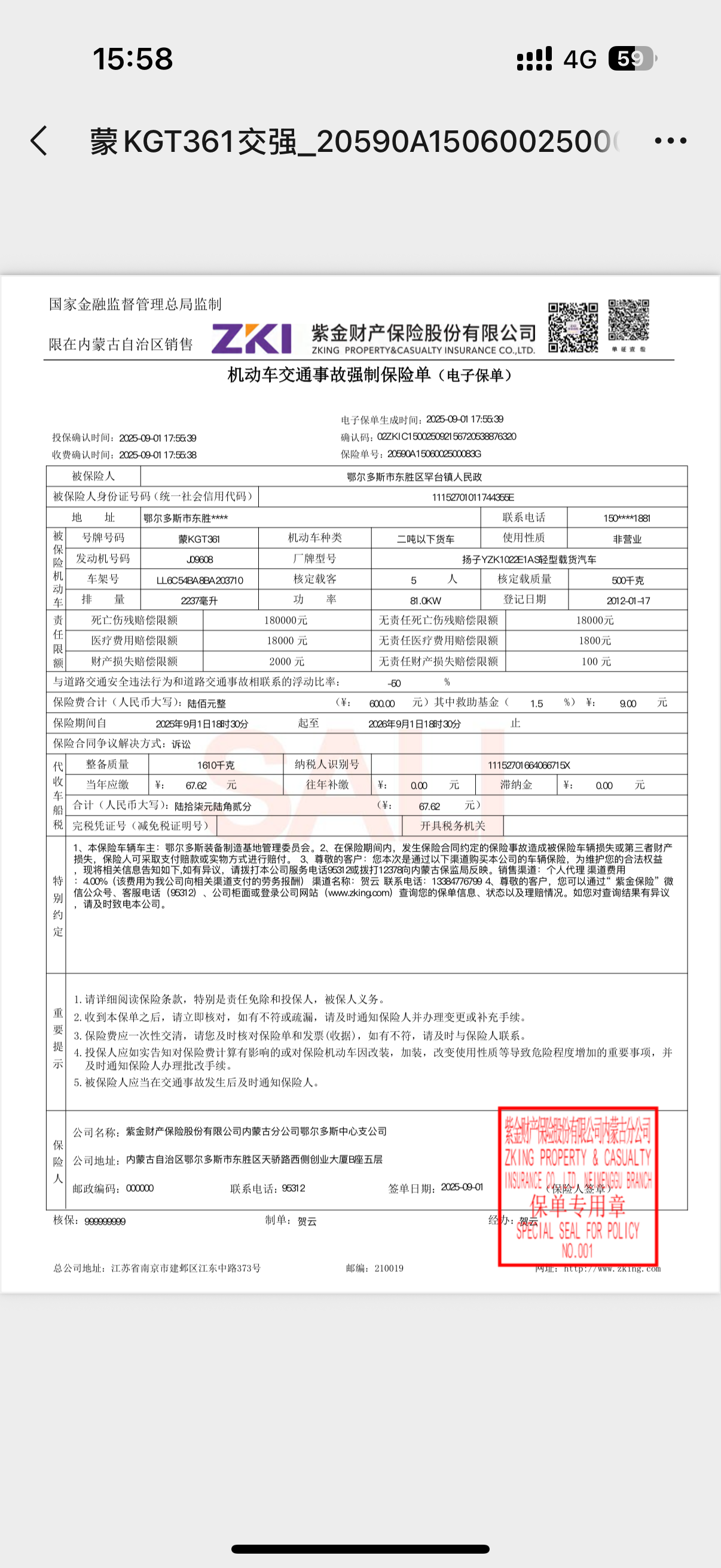 鄂尔多斯市东胜区罕台镇人民政府防火业务用车保单政府采购合同公告
