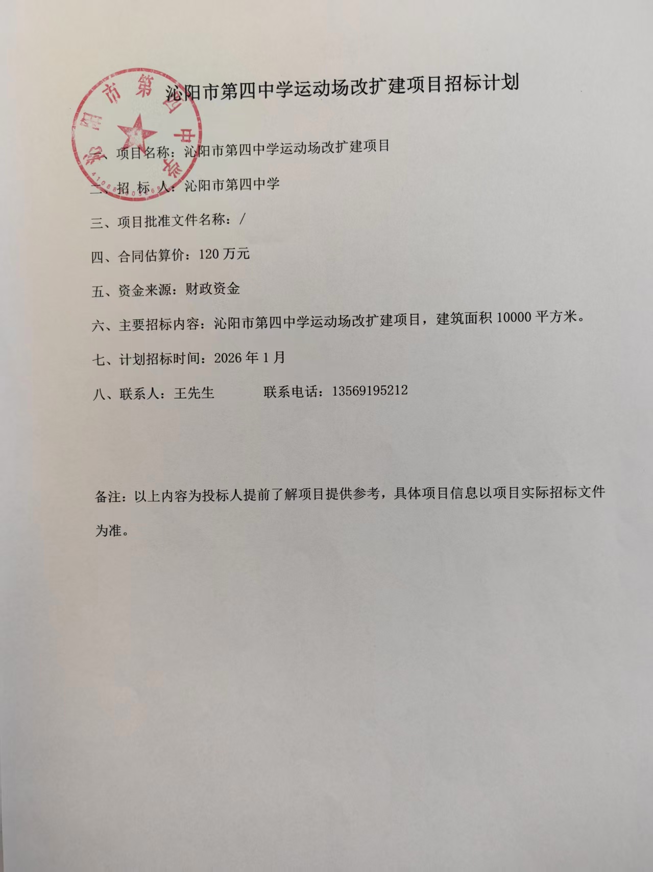 沁阳市第四中学运动场改扩建项目招标计划