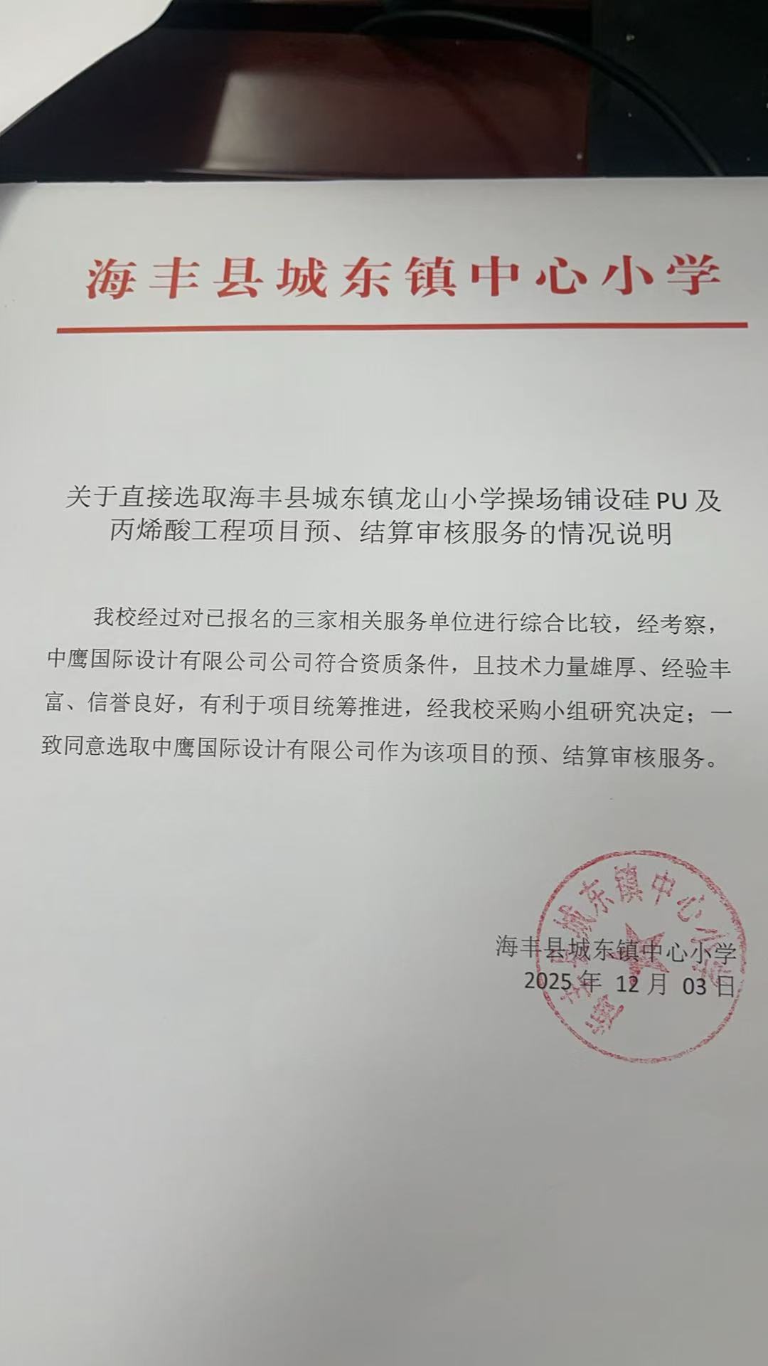 海丰县城东镇龙山小学操场铺设硅PU及丙烯酸工程项目直接选取预、结算审核服务中选公示