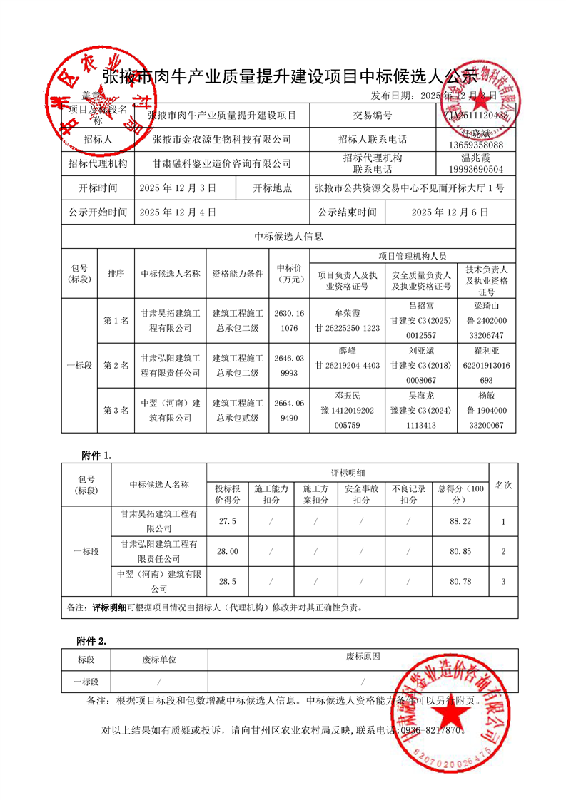 [市本级]张掖市肉牛产业质量提升建设项目中标候选人公示
