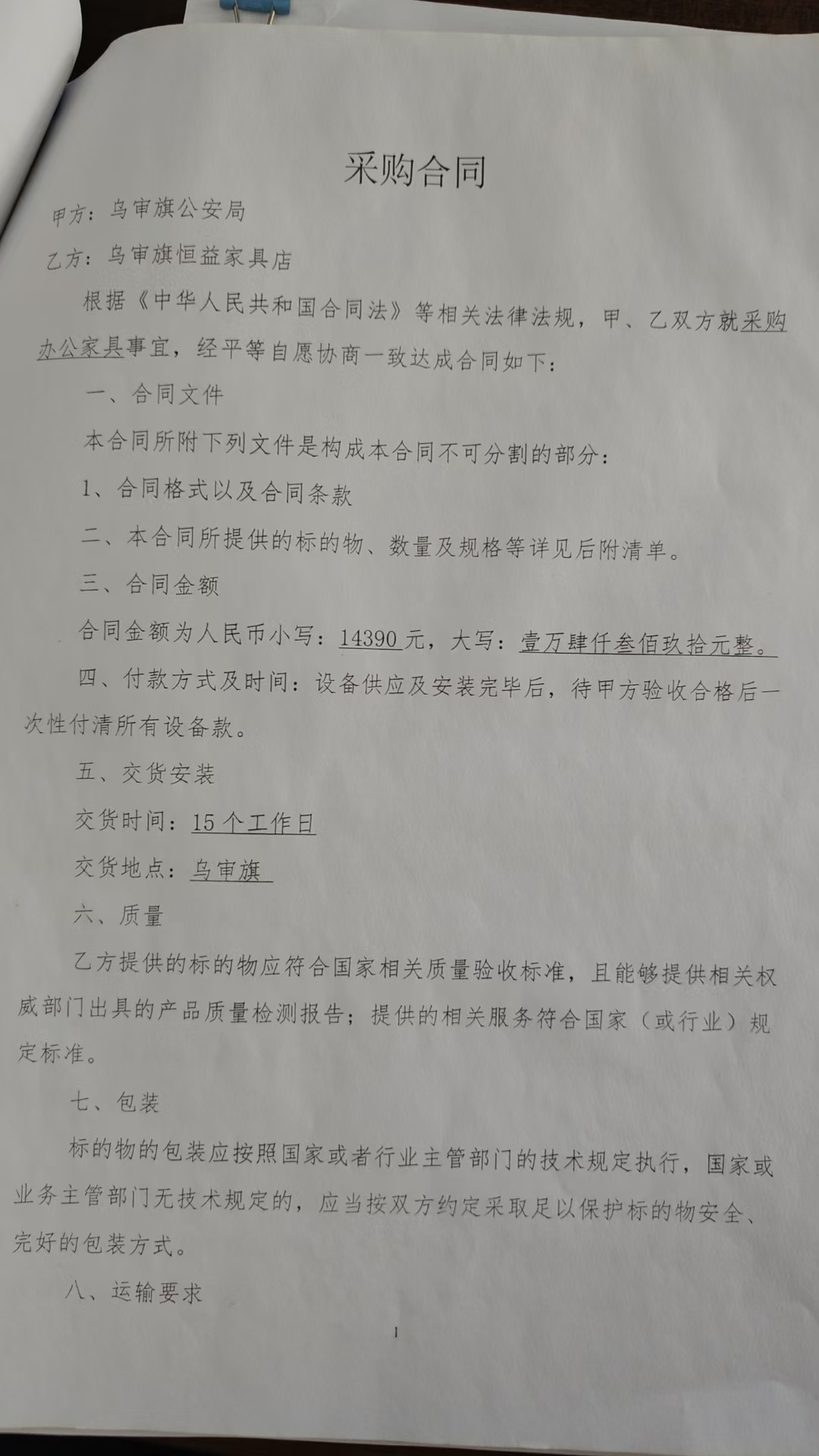 一、合同编号:**********二、合同名称:购买餐桌餐椅三、项目编号:鄂财购备字(电子)[****]*******号四、项目名称:购买餐桌餐椅等五、合同主体采购人(甲方):乌审旗公安局 地址:乌审旗嘎鲁图镇党政新区**号楼 联系方式:*********** 供应商(乙方):乌审旗恒益家具店 地址:内蒙古自治区鄂尔多斯市乌审旗嘎鲁图镇苏里格街 联系方式:*********** 六、合同主要信息主要标的: