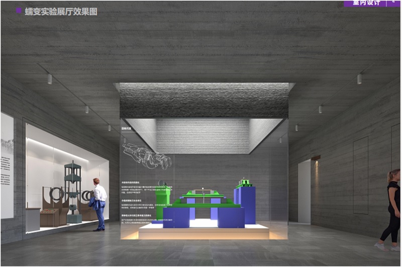 *.蠕变实验器材陈列区,进门口正对的玻璃面上为实验简介及资助单位等文字介绍。