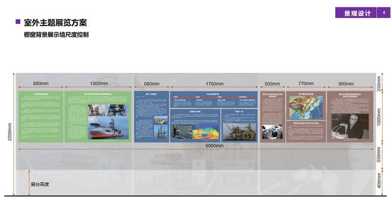 室外展区要求:甲方提供展览素材,按照甲方需求和理念,进行展板的设计制作。达到效果图所需配置(包括前言区及主展区设计制作,结尾处****制作)。玻璃及展板材料符合户外使用要求,方便更换及维修,易于打理。