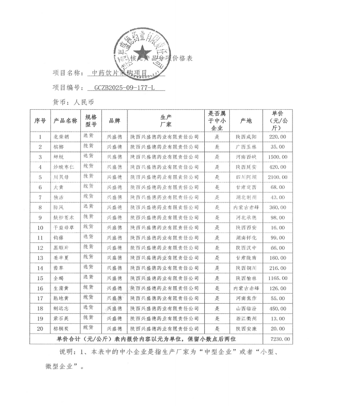 | 陕西兴盛德药业有限责任公司 | 陕西省铜川市新区南部工业园樱园路**号 | 综合评分法 | 是 | 单价:**,***.**元 | **.** |
