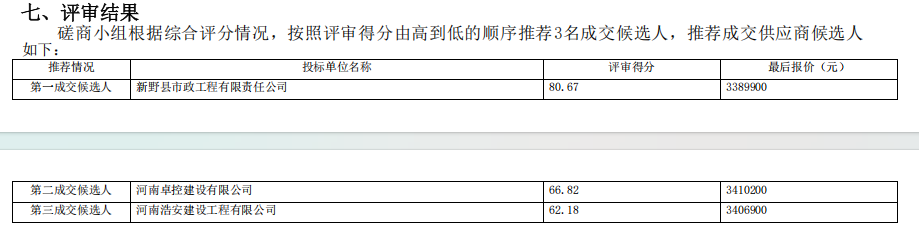 | *.本项目无供应商未通过资格审查和符合性审查;*.未成交供应商得分及排序:第*名:河南卓控建设有限公司,总得分**.**分;第*名:河南浩安建设工程有限公司,总得分**.**分;*.各有关当事人对成交结果有异议的,可以在本公告发布之日起七个工作日内,以书面形式向采购人和采购代理机构提出质疑(加盖单位公章且法人签字),由法定代表人或其原授权代表携带企业营业执照副本原件及本人身份证件(原件)一并提交(邮寄、传真件不予受理),质疑应当有明确的请求和必要的证明材料,并以质疑函接受确认日期作为受理时间,逾期未提交或未按照要求提交的质疑函将不予受理。 | |||||||||||||||||||||||||||||||