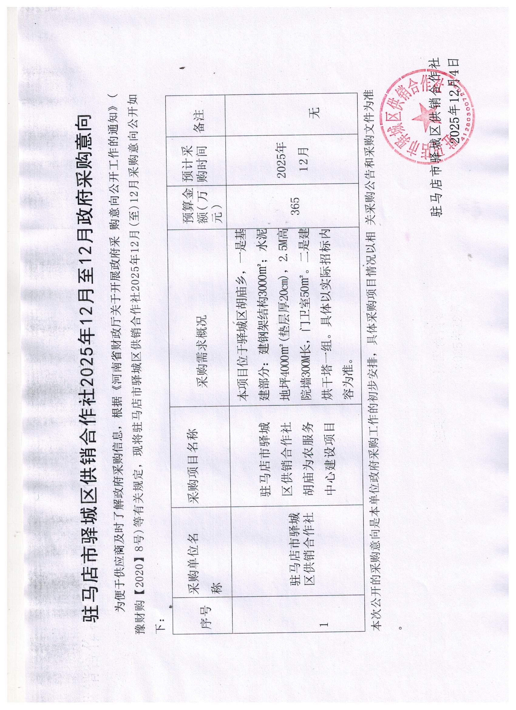 驻马店市驿城区供销合作社2025年12月政府采购意向