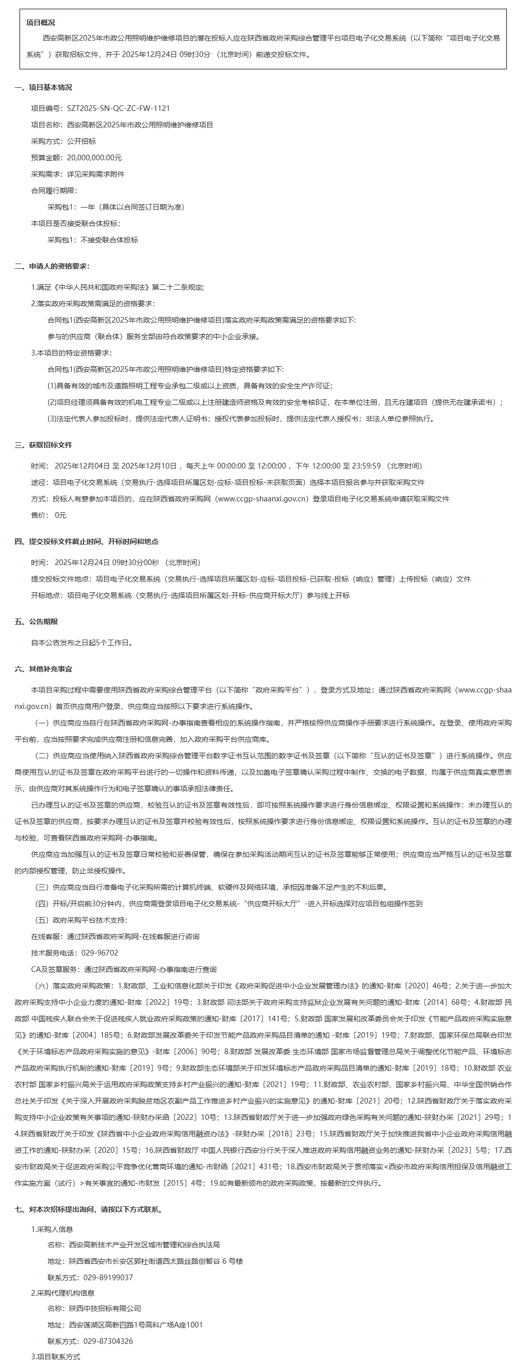 西安高新技术产业开发区城市管理和综合执法局西安高新区2025年市政公用照明维护维修项目招标公告