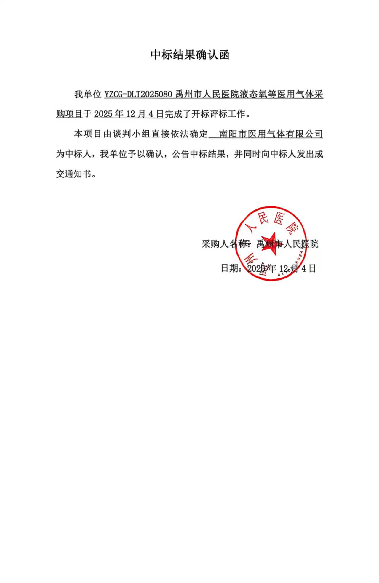 YZCG-DLT2025080禹州市人民医院液态氧等医用气体采购项目-成交公告