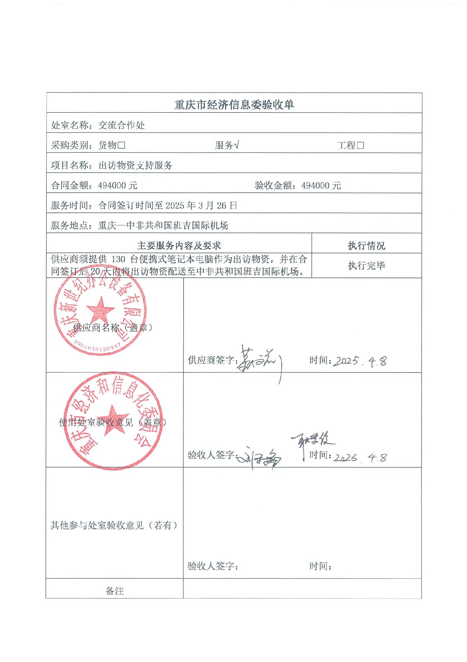 乙方须提供***台便携式笔记本电脑作为出访物资,并在合同签订后**天内将出访物资配送至中非共和国班吉国际机场(****** *’**** ************* *******)。
