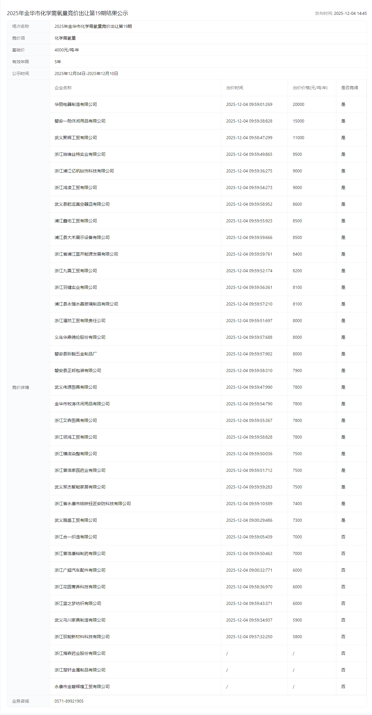 华市化学需氧量竞价出让第19期结果公示成交公示