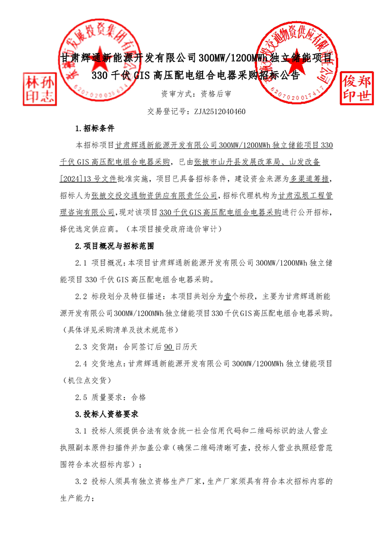 甘肃辉通新能源开发有限公司300MW1200MWh独立储能项目330千伏GIS高压配电组合电器采购