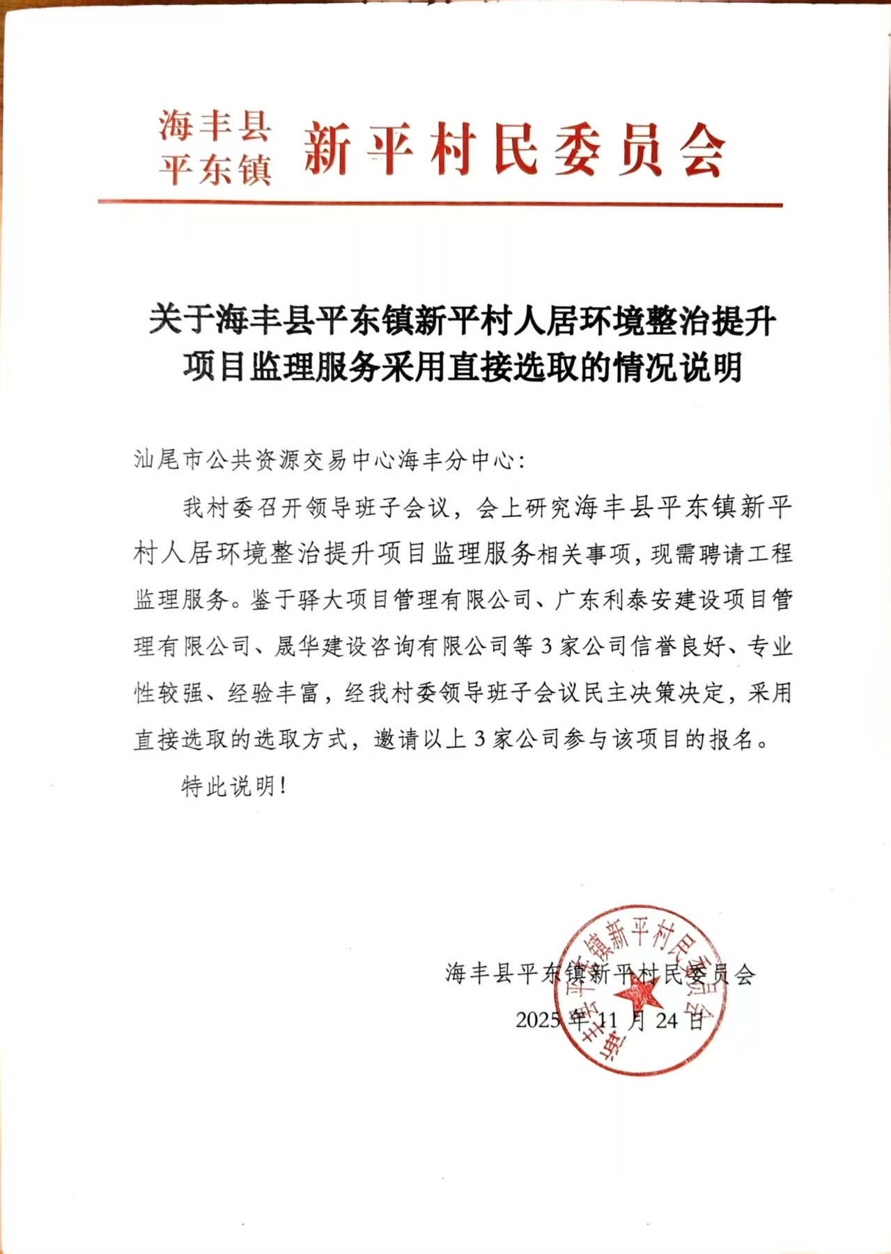 鉴于驿大项目管理有限公司、广东利泰安建设项目管理有限公司、晟华建设咨询有限公司等*家公司信誉良好、专业性较强、经验丰富,经我村委领导班子会议民主决策决定,采用直接选取的选取方式,邀请以上*家公司参与该项目的报名。
