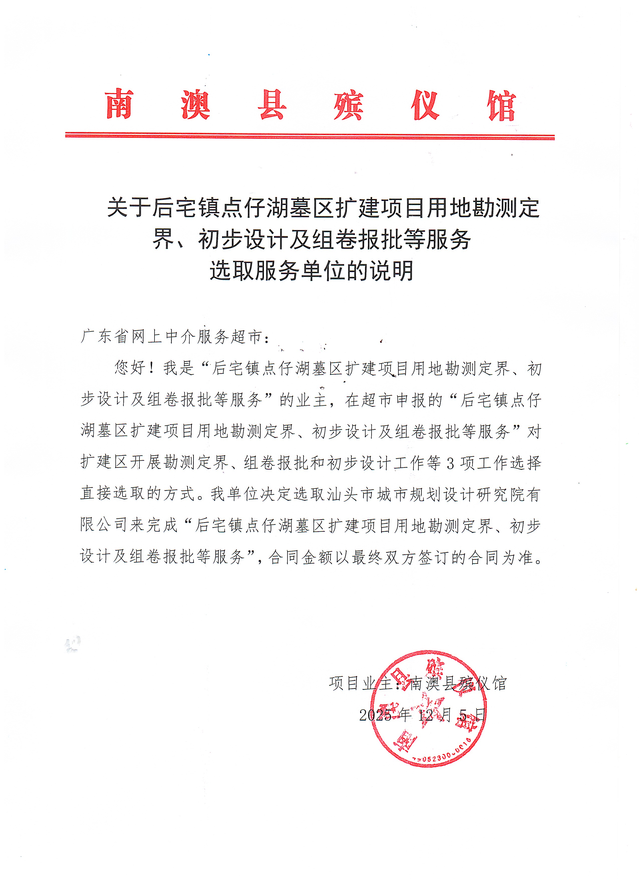 关于【后宅镇点仔湖墓区扩建项目用地勘测定界、初步设计及组卷报批等服务】中选结果的公告