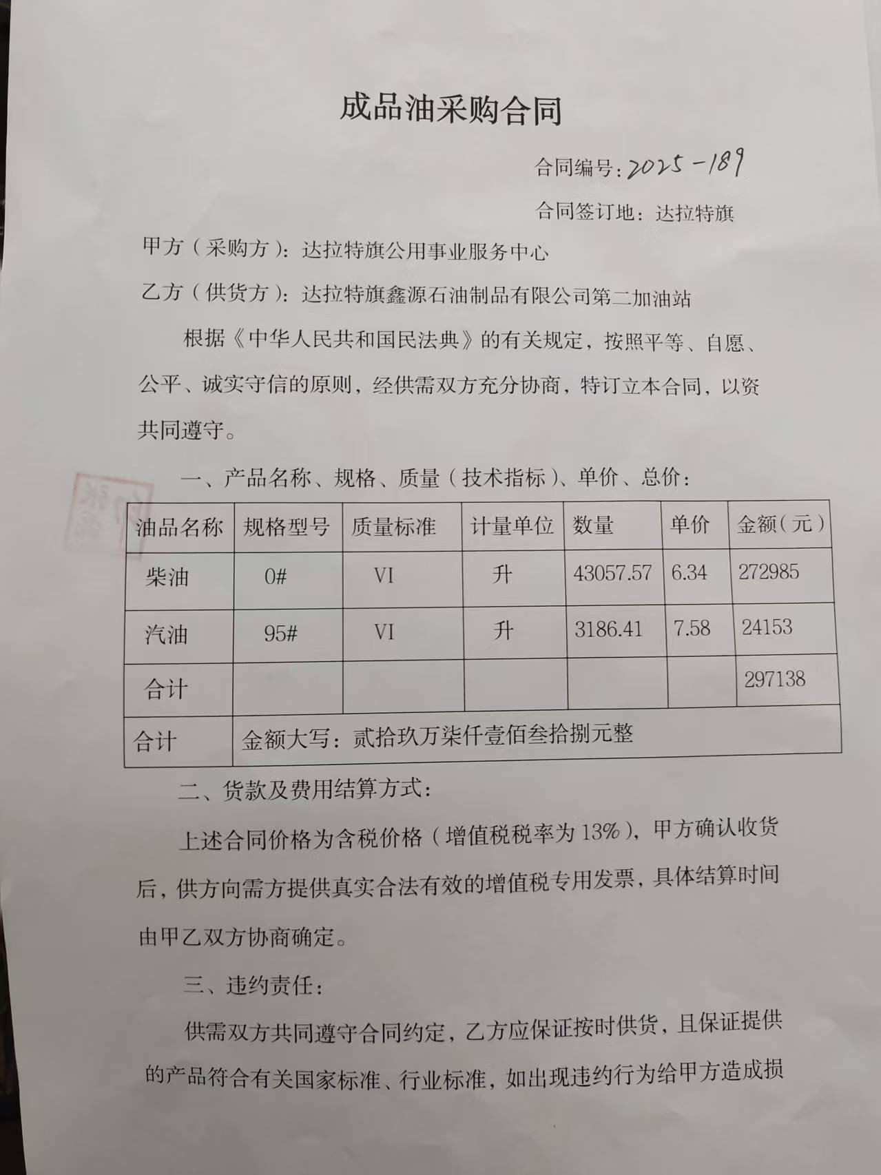 达拉特旗公用事业服务中心成品油采购合同政府采购合同公告