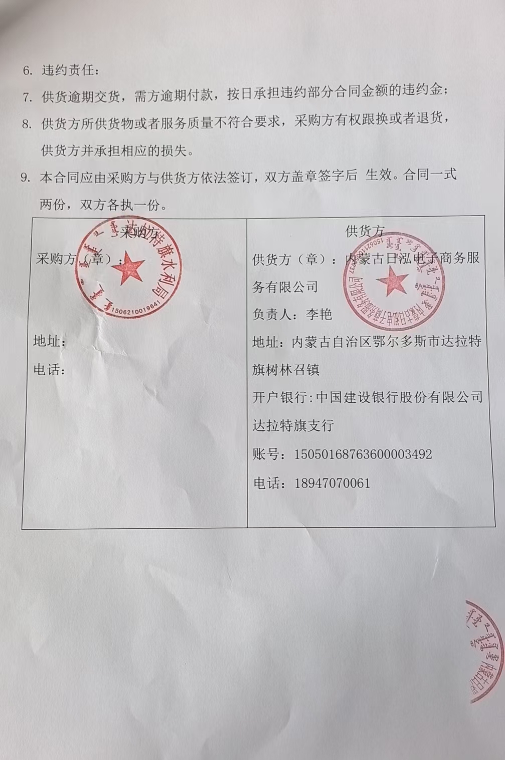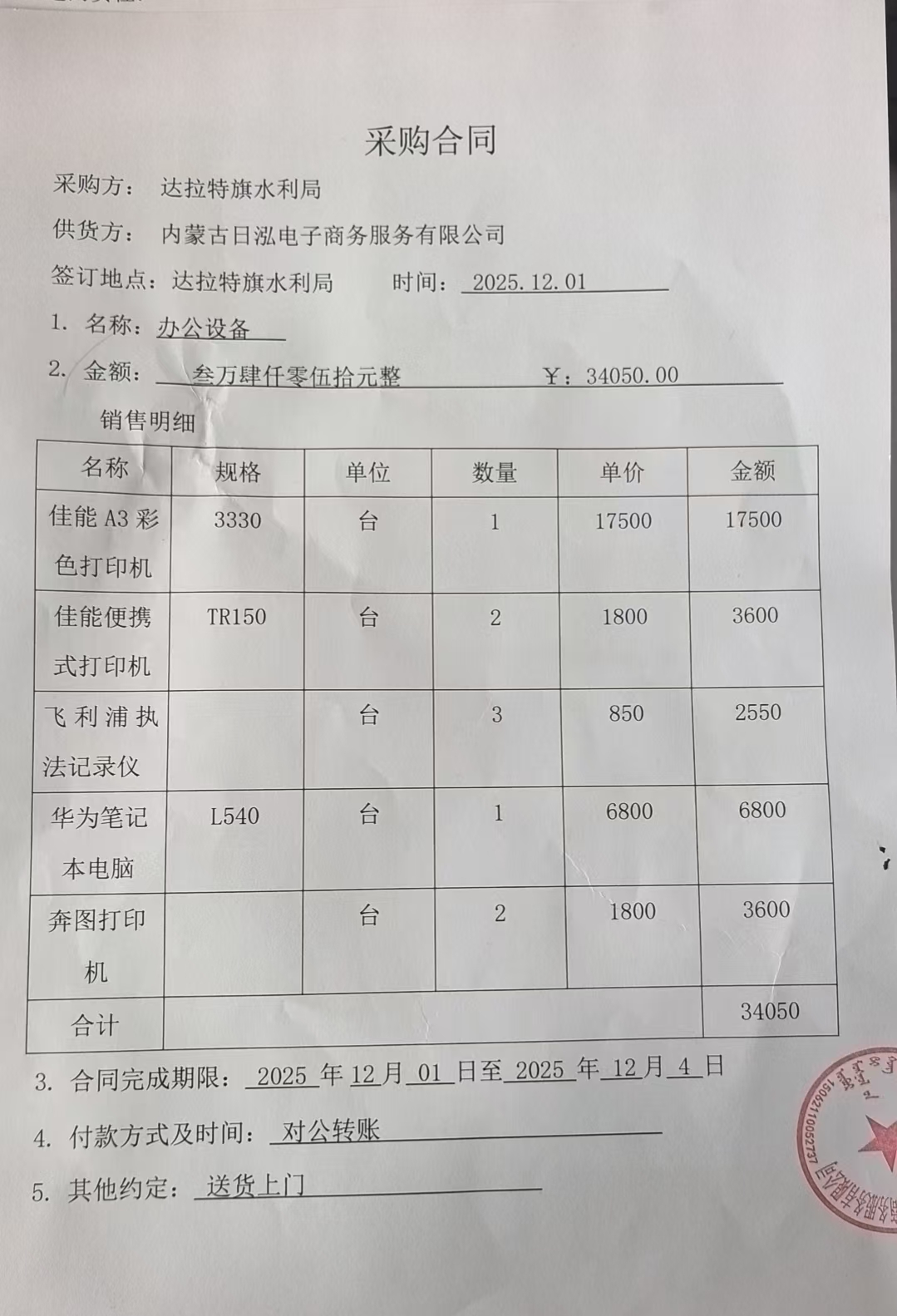 一、合同编号:***二、合同名称:采购合同三、项目编号:鄂财购备字(电子)[****]*******号四、项目名称:办公设备采购五、合同主体采购人(甲方):达拉特旗水利局 地址:鄂尔多斯市达拉特旗 联系方式:*********** 供应商(乙方):内蒙古日泓电子商务服务有限公司 地址:达拉特旗· 联系方式:*********** 六、合同主要信息主要标的: